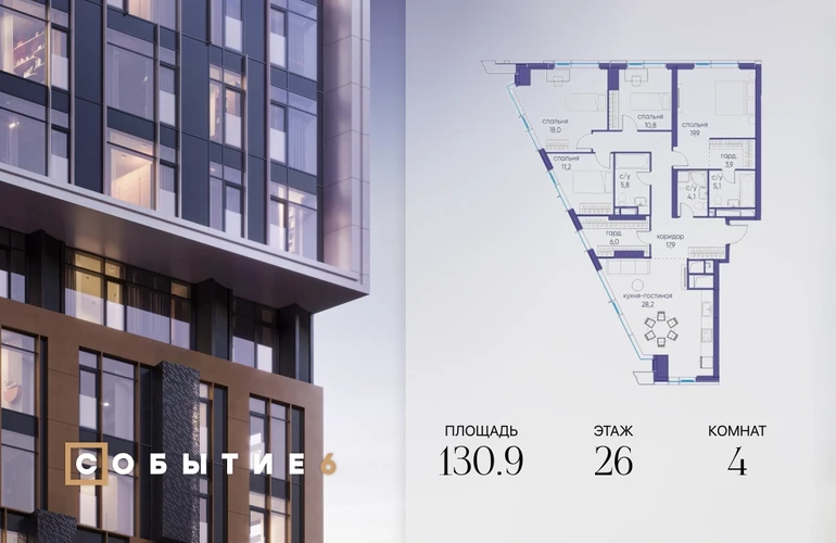 Продаётся 4-комнатная квартира от застройщика: общая площадь 130.90 м², жилая 59.90 м², кухня 28.20 м², 26-й этаж, жилой квартал «Событие-6», корпус 2 (секция 5) Срок сдачи: 4 квартал 2029 года. Позвоните сейчас и забронируйте квартиру! Продуманный до деталей. Созданный для жизни, полной счастливых событий. Парк-квартал СОБЫТИЕ — это жизнь класса премиум в престижном районе на Мосфильмовской улице. Архитектура мирового уровня. Выигрышное расположение на границе природного комплекса «Долина реки Раменки». Все для комфортной жизни и досуга: от детсадов и школ до ресторанов и медцентров. И новая точка притяжения — уже готовый парк «Событие» с пространствами активности для всех возрастов и интересов. Особенности квартала: • «Парящие» мосты и парк под облаками - уникальный дом с самыми завораживающими видами из окон «в пол» • Собственный парк — сразу за порогом! • Архитектурная концепция от известных международных бюро LDA Design и UHA London • Инфраструктура «тапочной доступности»: в кафе, школу, магазин — за пару минут! • Внутренний двор — настоящее продолжение вашего дома: закрытая охраняемая территория без машин, развивающие детские площадки, воркауты-зоны для тех, кто хочет быть в форме, площади для праздников и посиделок с соседями.О застройщике
