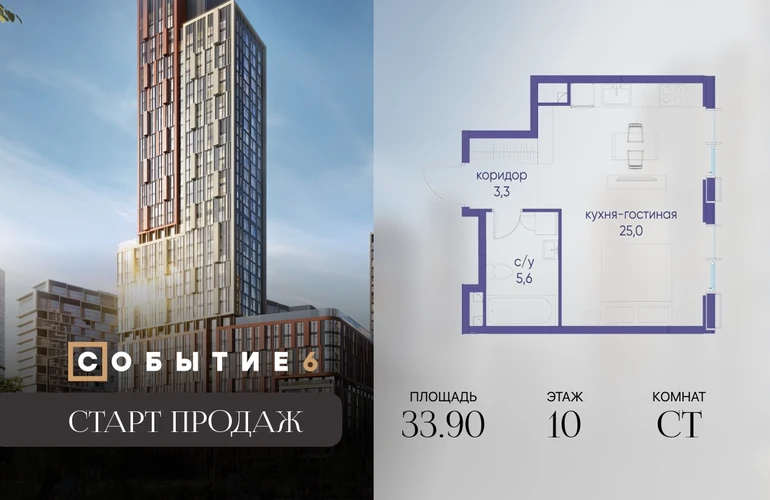 Продаётся квартира-студия от застройщика: общая площадь 33.90 м², жилая 20.00 м², кухня 5.00 м², 10-й этаж, жилой квартал «Событие-6», корпус 2 (секция 2) Срок сдачи: 1 квартал 2029 года. Позвоните сейчас и забронируйте квартиру! Продуманный до деталей. Созданный для жизни, полной счастливых событий. Парк-квартал СОБЫТИЕ — это жизнь класса премиум в престижном районе на Мосфильмовской улице. Архитектура мирового уровня. Выигрышное расположение на границе природного комплекса «Долина реки Раменки». Все для комфортной жизни и досуга: от детсадов и школ до ресторанов и медцентров. И новая точка притяжения — уже готовый парк «Событие» с пространствами активности для всех возрастов и интересов. Особенности квартала: • «Парящие» мосты и парк под облаками - уникальный дом с самыми завораживающими видами из окон «в пол» • Собственный парк — сразу за порогом! • Архитектурная концепция от известных международных бюро LDA Design и UHA London • Инфраструктура «тапочной доступности»: в кафе, школу, магазин — за пару минут! • Внутренний двор — настоящее продолжение вашего дома: закрытая охраняемая территория без машин, развивающие детские площадки, воркауты-зоны для тех, кто хочет быть в форме, площади для праздников и посиделок с соседями.О застройщике