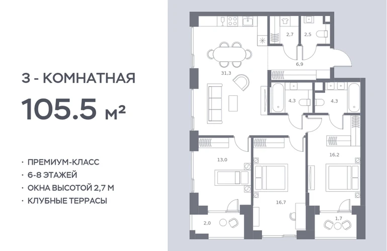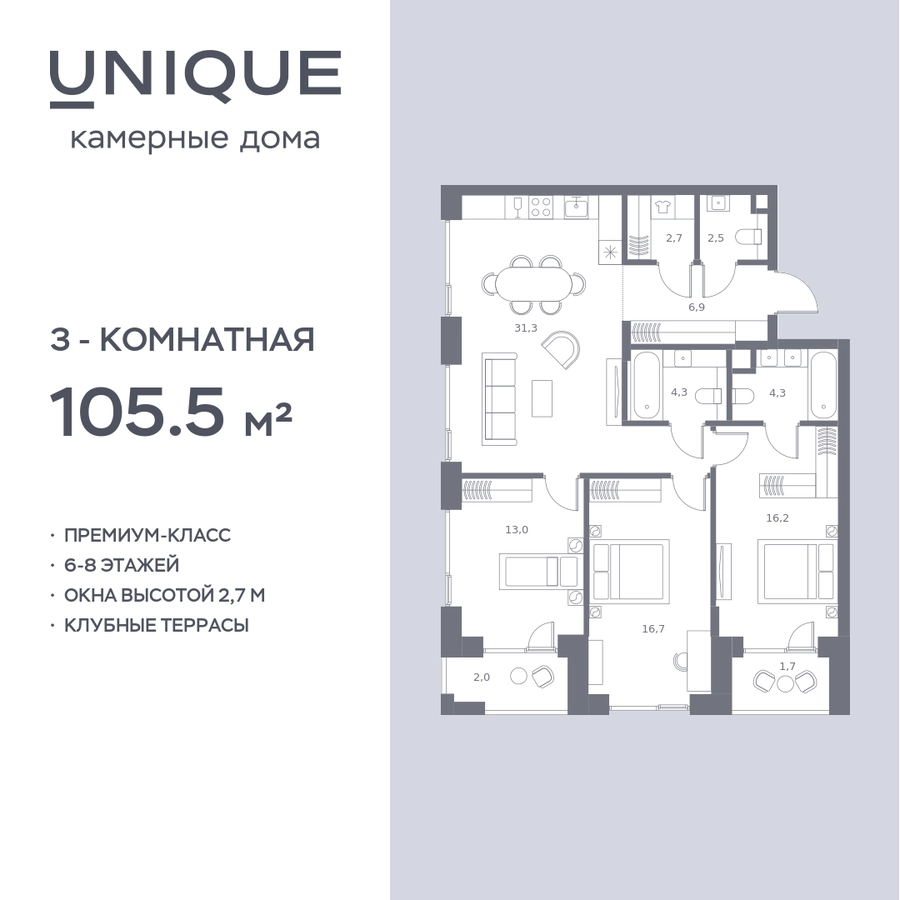 Цены указаны с условием 100% оплаты и стандартной ипотеки. Прямая продажа от застройщика! Продается 3-к. квартира номер 839 общей площадью 105.5 кв.м. на 2-м этаже 8 этажного дома, корпус UNIQUE (премиум-класс). Без отделки. Проект бизнес-класса SOUL от девелопера FORMA. До метро Сокол 10 мин пешком. Архитектура от британского бюро SimpsonHaugh. Благоустройство дворов — Gillespies и GAFA. Территория состоит из культурного парка и приватных дворов. Озеленение в эстетике лесного оазиса. Насыщенное благоустройство: прогулочные тропинки, релакс-зоны, пряный и сенсорный сады, развивающие детские площадки и воркауты. В центре проекта объект культурного наследия — общественное пространство Изофабрика, построенная в 30-х годах по проекту архитектора Георгия Гольца. Здесь будут располагаться мастерские для взрослых и детей, выставочные залы, коворкинги, образовательный центр, рестораны и кафе. Квартиры с панорамными окнами, мастер-спальнями, гардеробными, классическими балконами и лоджиями, видовыми террасами. Высота потолков от 2,9 до 3,5 м. В проекте 2 детских сада на 100 и 200 малышей. Клубная гостиная, фитнес-рум, детская игровая комната, дизайнерские лобби, подземный паркинг и келлеры.О застройщике