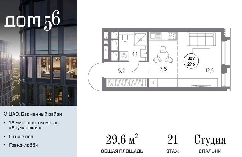 В премиум-квартале «Дом 56» на Бауманской напрямую от девелопера ГК «Галс-Девелопмент» представлена студия на 21 этаже общей площадью 29.60 м². Квартира предлагается без отделки, со свободной планировкой. Пространство позволяет воплотить дизайн - проект в соответствии с Вашими предпочтениями. «Дом 56» — расположен в Басманном районе на ул. Фридриха Энгельса, всего в 12-15 минутах пешком от станций метро «Бауманская» и «Электрозаводская». Рядом с премиум-кварталом находятся важные городские магистрали — ТТК, набережная реки Яузы и Бакунинская улица, переходящая в Спартаковскую и Маросейку. Архитектурный стиль «Дома 56» — параметрический минимализм. Футуристические фасады квартала с «эффектом закручивания» словно вращаются вокруг своей оси. Динамичный образ башен дополняет эффектное остекление — окна в пол будут в каждой квартире. «Дом 56» станет органичным продолжением современной научно-креативной среды Басманного района: — Развитое окружение — десятки различных точек притяжения; — Близость престижных вузов: МГТУ, МЭИ и Британская высшая школа дизайна; — Соседство с Технологической долиной и всем необходимым для запуска стартапа; — Набережные и парки для спорта и отдыха. «Дом 56» оснащён первоклассными инженерными системами. Входы на территорию, в здание и паркинг оборудованы системой контроля и управления доступом. С любого этажа в лобби и паркинг спускаются быстрые и бесшумные лифты премиального бренда. Во внутреннем приватном дворе будет создано пространство в бионическом стиле с лаунж-зонами, подвесными качелями, детскими плейхабами для разных возрастов, площадками для спорта и отдыха в окружении зелени. На двух подземных уровнях предусмотрен подземный паркинг и кладовые помещения.О застройщике