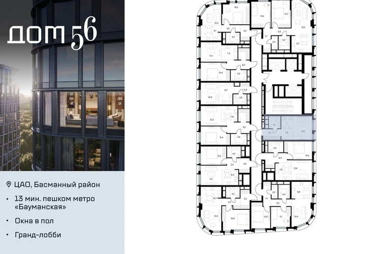 В премиум-квартале «Дом 56» на Бауманской напрямую от девелопера ГК «Галс-Девелопмент» представлена студия на 21 этаже общей площадью 29.60 м². Квартира предлагается без отделки, со свободной планировкой. Пространство позволяет воплотить дизайн - проект в соответствии с Вашими предпочтениями. «Дом 56» — расположен в Басманном районе на ул. Фридриха Энгельса, всего в 12-15 минутах пешком от станций метро «Бауманская» и «Электрозаводская». Рядом с премиум-кварталом находятся важные городские магистрали — ТТК, набережная реки Яузы и Бакунинская улица, переходящая в Спартаковскую и Маросейку. Архитектурный стиль «Дома 56» — параметрический минимализм. Футуристические фасады квартала с «эффектом закручивания» словно вращаются вокруг своей оси. Динамичный образ башен дополняет эффектное остекление — окна в пол будут в каждой квартире. «Дом 56» станет органичным продолжением современной научно-креативной среды Басманного района: — Развитое окружение — десятки различных точек притяжения; — Близость престижных вузов: МГТУ, МЭИ и Британская высшая школа дизайна; — Соседство с Технологической долиной и всем необходимым для запуска стартапа; — Набережные и парки для спорта и отдыха. «Дом 56» оснащён первоклассными инженерными системами. Входы на территорию, в здание и паркинг оборудованы системой контроля и управления доступом. С любого этажа в лобби и паркинг спускаются быстрые и бесшумные лифты премиального бренда. Во внутреннем приватном дворе будет создано пространство в бионическом стиле с лаунж-зонами, подвесными качелями, детскими плейхабами для разных возрастов, площадками для спорта и отдыха в окружении зелени. На двух подземных уровнях предусмотрен подземный паркинг и кладовые помещения.О застройщике