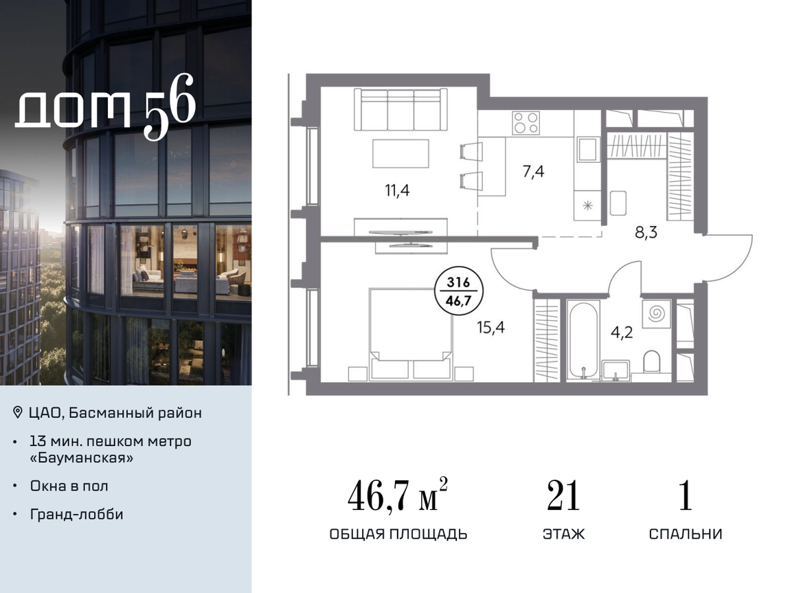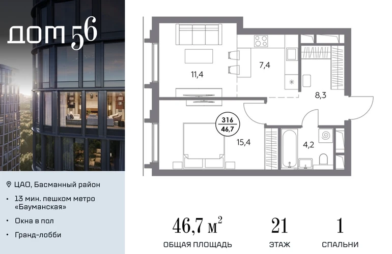 В премиум-квартале «Дом 56» на Бауманской напрямую от девелопера ГК «Галс-Девелопмент» представлена 1-комнатная квартира на 21 этаже общей площадью 46.70 м². Квартира предлагается без отделки, со свободной планировкой. Пространство позволяет воплотить дизайн - проект в соответствии с Вашими предпочтениями. «Дом 56» — расположен в Басманном районе на ул. Фридриха Энгельса, всего в 12-15 минутах пешком от станций метро «Бауманская» и «Электрозаводская». Рядом с премиум-кварталом находятся важные городские магистрали — ТТК, набережная реки Яузы и Бакунинская улица, переходящая в Спартаковскую и Маросейку. Архитектурный стиль «Дома 56» — параметрический минимализм. Футуристические фасады квартала с «эффектом закручивания» словно вращаются вокруг своей оси. Динамичный образ башен дополняет эффектное остекление — окна в пол будут в каждой квартире. «Дом 56» станет органичным продолжением современной научно-креативной среды Басманного района: — Развитое окружение — десятки различных точек притяжения; — Близость престижных вузов: МГТУ, МЭИ и Британская высшая школа дизайна; — Соседство с Технологической долиной и всем необходимым для запуска стартапа; — Набережные и парки для спорта и отдыха. «Дом 56» оснащён первоклассными инженерными системами. Входы на территорию, в здание и паркинг оборудованы системой контроля и управления доступом. С любого этажа в лобби и паркинг спускаются быстрые и бесшумные лифты премиального бренда. Во внутреннем приватном дворе будет создано пространство в бионическом стиле с лаунж-зонами, подвесными качелями, детскими плейхабами для разных возрастов, площадками для спорта и отдыха в окружении зелени. На двух подземных уровнях предусмотрен подземный паркинг и кладовые помещения.О застройщике