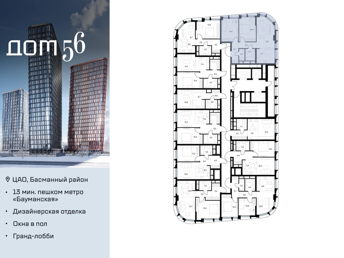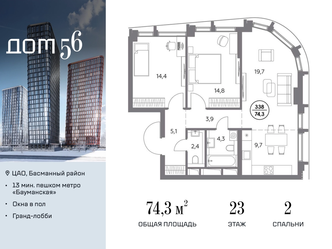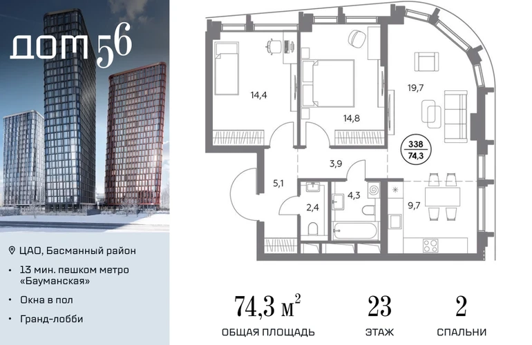 В премиум-квартале «Дом 56» на Бауманской напрямую от девелопера ГК «Галс-Девелопмент» представлена 2-комнатная квартира на 23 этаже общей площадью 74.30 м². Квартира предлагается без отделки, со свободной планировкой. Пространство позволяет воплотить дизайн - проект в соответствии с Вашими предпочтениями. «Дом 56» — расположен в Басманном районе на ул. Фридриха Энгельса, всего в 12-15 минутах пешком от станций метро «Бауманская» и «Электрозаводская». Рядом с премиум-кварталом находятся важные городские магистрали — ТТК, набережная реки Яузы и Бакунинская улица, переходящая в Спартаковскую и Маросейку. Архитектурный стиль «Дома 56» — параметрический минимализм. Футуристические фасады квартала с «эффектом закручивания» словно вращаются вокруг своей оси. Динамичный образ башен дополняет эффектное остекление — окна в пол будут в каждой квартире. «Дом 56» станет органичным продолжением современной научно-креативной среды Басманного района: — Развитое окружение — десятки различных точек притяжения; — Близость престижных вузов: МГТУ, МЭИ и Британская высшая школа дизайна; — Соседство с Технологической долиной и всем необходимым для запуска стартапа; — Набережные и парки для спорта и отдыха. «Дом 56» оснащён первоклассными инженерными системами. Входы на территорию, в здание и паркинг оборудованы системой контроля и управления доступом. С любого этажа в лобби и паркинг спускаются быстрые и бесшумные лифты премиального бренда. Во внутреннем приватном дворе будет создано пространство в бионическом стиле с лаунж-зонами, подвесными качелями, детскими плейхабами для разных возрастов, площадками для спорта и отдыха в окружении зелени. На двух подземных уровнях предусмотрен подземный паркинг и кладовые помещения.О застройщике