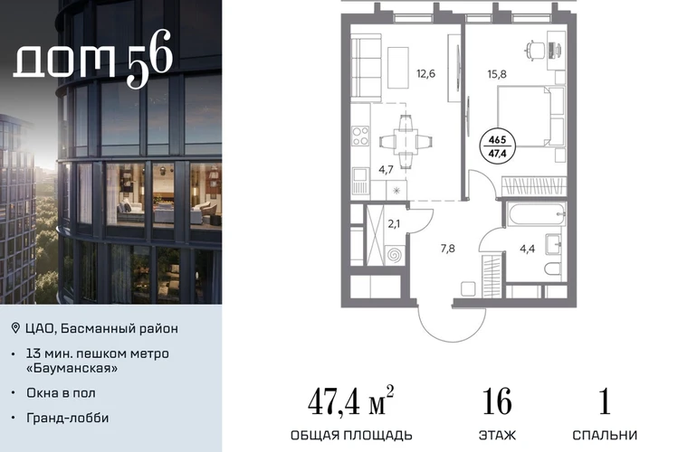 В премиум-квартале «Дом 56» на Бауманской напрямую от девелопера ГК «Галс-Девелопмент» представлена 1-комнатная квартира на 16 этаже общей площадью 47.40 м². Квартира предлагается без отделки, со свободной планировкой. Пространство позволяет воплотить дизайн - проект в соответствии с Вашими предпочтениями. «Дом 56» — расположен в Басманном районе на ул. Фридриха Энгельса, всего в 12-15 минутах пешком от станций метро «Бауманская» и «Электрозаводская». Рядом с премиум-кварталом находятся важные городские магистрали — ТТК, набережная реки Яузы и Бакунинская улица, переходящая в Спартаковскую и Маросейку. Архитектурный стиль «Дома 56» — параметрический минимализм. Футуристические фасады квартала с «эффектом закручивания» словно вращаются вокруг своей оси. Динамичный образ башен дополняет эффектное остекление — окна в пол будут в каждой квартире. «Дом 56» станет органичным продолжением современной научно-креативной среды Басманного района: — Развитое окружение — десятки различных точек притяжения; — Близость престижных вузов: МГТУ, МЭИ и Британская высшая школа дизайна; — Соседство с Технологической долиной и всем необходимым для запуска стартапа; — Набережные и парки для спорта и отдыха. «Дом 56» оснащён первоклассными инженерными системами. Входы на территорию, в здание и паркинг оборудованы системой контроля и управления доступом. С любого этажа в лобби и паркинг спускаются быстрые и бесшумные лифты премиального бренда. Во внутреннем приватном дворе будет создано пространство в бионическом стиле с лаунж-зонами, подвесными качелями, детскими плейхабами для разных возрастов, площадками для спорта и отдыха в окружении зелени. На двух подземных уровнях предусмотрен подземный паркинг и кладовые помещения.О застройщике