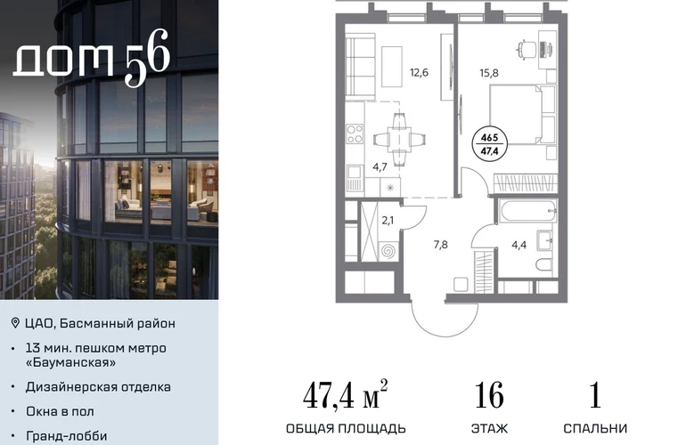 В премиум-квартале «Дом 56» на Бауманской напрямую от девелопера ГК «Галс-Девелопмент» представлена 1-комнатная квартира на 16 этаже общей площадью 47.40 м². Квартира предлагается без отделки, со свободной планировкой. Пространство позволяет воплотить дизайн - проект в соответствии с Вашими предпочтениями. «Дом 56» — расположен в Басманном районе на ул. Фридриха Энгельса, всего в 12-15 минутах пешком от станций метро «Бауманская» и «Электрозаводская». Рядом с премиум-кварталом находятся важные городские магистрали — ТТК, набережная реки Яузы и Бакунинская улица, переходящая в Спартаковскую и Маросейку. Архитектурный стиль «Дома 56» — параметрический минимализм. Футуристические фасады квартала с «эффектом закручивания» словно вращаются вокруг своей оси. Динамичный образ башен дополняет эффектное остекление — окна в пол будут в каждой квартире. «Дом 56» станет органичным продолжением современной научно-креативной среды Басманного района: — Развитое окружение — десятки различных точек притяжения; — Близость престижных вузов: МГТУ, МЭИ и Британская высшая школа дизайна; — Соседство с Технологической долиной и всем необходимым для запуска стартапа; — Набережные и парки для спорта и отдыха. «Дом 56» оснащён первоклассными инженерными системами. Входы на территорию, в здание и паркинг оборудованы системой контроля и управления доступом. С любого этажа в лобби и паркинг спускаются быстрые и бесшумные лифты премиального бренда. Во внутреннем приватном дворе будет создано пространство в бионическом стиле с лаунж-зонами, подвесными качелями, детскими плейхабами для разных возрастов, площадками для спорта и отдыха в окружении зелени. На двух подземных уровнях предусмотрен подземный паркинг и кладовые помещения.О застройщике