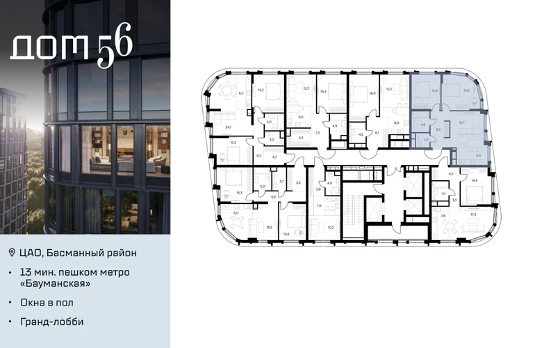 В премиум-квартале «Дом 56» на Бауманской напрямую от девелопера ГК «Галс-Девелопмент» представлена 2-комнатная квартира на 3 этаже общей площадью 66.80 м². Квартира с качественной отделкой в одном из двух вариантов - Smart White и Casual Grey. Финишная отделка будет выполнена «под ключ» - от возведения внутренних перегородок до установки встроенных светильников. В отделке будут использованы высококачественные премиальные материалы, в том числе керамогранит с текстурой мрамора Калакатта и благородного иранского известняка, а также напольное покрытие из дубовой инженерной доски. Ванные комнаты полностью укомплектовываются премиальной сантехникой немецких брендов, включая дизайнерские тумбы под раковину и душевые стойки с системой термостат. «Дом 56» — расположен в Басманном районе на ул. Фридриха Энгельса, всего в 12-15 минутах пешком от станций метро «Бауманская» и «Электрозаводская». Рядом с премиум-кварталом находятся важные городские магистрали — ТТК, набережная реки Яузы и Бакунинская улица, переходящая в Спартаковскую и Маросейку. Архитектурный стиль «Дома 56» — параметрический минимализм. Футуристические фасады квартала с «эффектом закручивания» словно вращаются вокруг своей оси. Динамичный образ башен дополняет эффектное остекление — окна в пол будут в каждой квартире. «Дом 56» станет органичным продолжением современной научно-креативной среды Басманного района: — Развитое окружение — десятки различных точек притяжения; — Близость престижных вузов: МГТУ, МЭИ и Британская высшая школа дизайна; — Соседство с Технологической долиной и всем необходимым для запуска стартапа; — Набережные и парки для спорта и отдыха. «Дом 56» оснащён первоклассными инженерными системами. Входы на территорию, в здание и паркинг оборудованы системой контроля и управления доступом. С любого этажа в лобби и паркинг спускаются быстрые и бесшумные лифты премиального бренда. Во внутреннем приватном дворе будет создано пространство в бионическом стиле с лаунж-зонами, подвесными качелями, детскими плейхабами для разных возрастов, площадками для спорта и отдыха в окружении зелени. На двух подземных уровнях предусмотрен подземный паркинг и кладовые помещения.О застройщике