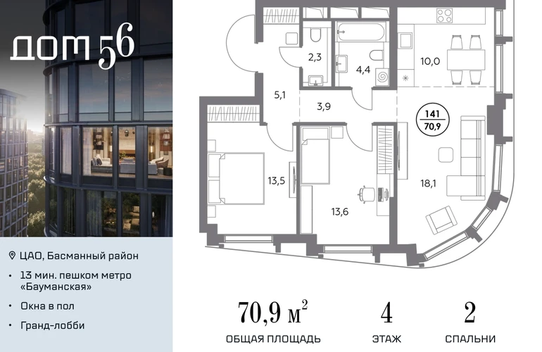 В премиум-квартале «Дом 56» на Бауманской напрямую от девелопера ГК «Галс-Девелопмент» представлена 2-комнатная квартира на 4 этаже общей площадью 70.90 м². Квартира предлагается без отделки, со свободной планировкой. Пространство позволяет воплотить дизайн - проект в соответствии с Вашими предпочтениями. «Дом 56» — расположен в Басманном районе на ул. Фридриха Энгельса, всего в 12-15 минутах пешком от станций метро «Бауманская» и «Электрозаводская». Рядом с премиум-кварталом находятся важные городские магистрали — ТТК, набережная реки Яузы и Бакунинская улица, переходящая в Спартаковскую и Маросейку. Архитектурный стиль «Дома 56» — параметрический минимализм. Футуристические фасады квартала с «эффектом закручивания» словно вращаются вокруг своей оси. Динамичный образ башен дополняет эффектное остекление — окна в пол будут в каждой квартире. «Дом 56» станет органичным продолжением современной научно-креативной среды Басманного района: — Развитое окружение — десятки различных точек притяжения; — Близость престижных вузов: МГТУ, МЭИ и Британская высшая школа дизайна; — Соседство с Технологической долиной и всем необходимым для запуска стартапа; — Набережные и парки для спорта и отдыха. «Дом 56» оснащён первоклассными инженерными системами. Входы на территорию, в здание и паркинг оборудованы системой контроля и управления доступом. С любого этажа в лобби и паркинг спускаются быстрые и бесшумные лифты премиального бренда. Во внутреннем приватном дворе будет создано пространство в бионическом стиле с лаунж-зонами, подвесными качелями, детскими плейхабами для разных возрастов, площадками для спорта и отдыха в окружении зелени. На двух подземных уровнях предусмотрен подземный паркинг и кладовые помещения.О застройщике