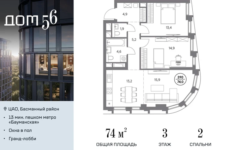 В премиум-квартале «Дом 56» на Бауманской напрямую от девелопера ГК «Галс-Девелопмент» представлена 2-комнатная квартира на 3 этаже общей площадью 74.00 м². Квартира предлагается без отделки, со свободной планировкой. Пространство позволяет воплотить дизайн - проект в соответствии с Вашими предпочтениями. «Дом 56» — расположен в Басманном районе на ул. Фридриха Энгельса, всего в 12-15 минутах пешком от станций метро «Бауманская» и «Электрозаводская». Рядом с премиум-кварталом находятся важные городские магистрали — ТТК, набережная реки Яузы и Бакунинская улица, переходящая в Спартаковскую и Маросейку. Архитектурный стиль «Дома 56» — параметрический минимализм. Футуристические фасады квартала с «эффектом закручивания» словно вращаются вокруг своей оси. Динамичный образ башен дополняет эффектное остекление — окна в пол будут в каждой квартире. «Дом 56» станет органичным продолжением современной научно-креативной среды Басманного района: — Развитое окружение — десятки различных точек притяжения; — Близость престижных вузов: МГТУ, МЭИ и Британская высшая школа дизайна; — Соседство с Технологической долиной и всем необходимым для запуска стартапа; — Набережные и парки для спорта и отдыха. «Дом 56» оснащён первоклассными инженерными системами. Входы на территорию, в здание и паркинг оборудованы системой контроля и управления доступом. С любого этажа в лобби и паркинг спускаются быстрые и бесшумные лифты премиального бренда. Во внутреннем приватном дворе будет создано пространство в бионическом стиле с лаунж-зонами, подвесными качелями, детскими плейхабами для разных возрастов, площадками для спорта и отдыха в окружении зелени. На двух подземных уровнях предусмотрен подземный паркинг и кладовые помещения.О застройщике