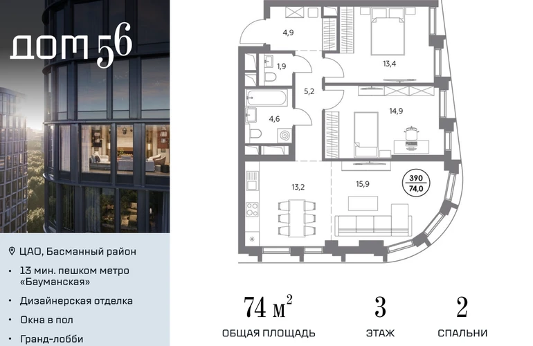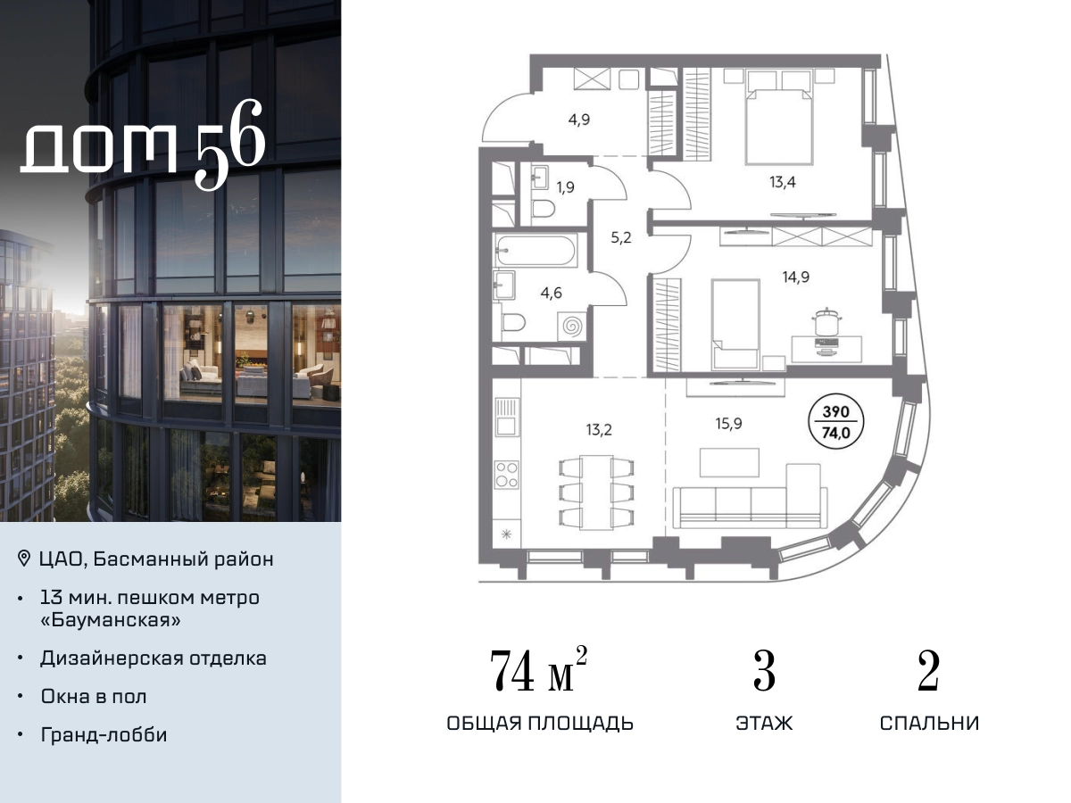 В премиум-квартале «Дом 56» на Бауманской напрямую от девелопера ГК «Галс-Девелопмент» представлена 2-комнатная квартира на 3 этаже общей площадью 74.00 м². Квартира предлагается без отделки, со свободной планировкой. Пространство позволяет воплотить дизайн - проект в соответствии с Вашими предпочтениями. «Дом 56» — расположен в Басманном районе на ул. Фридриха Энгельса, всего в 12-15 минутах пешком от станций метро «Бауманская» и «Электрозаводская». Рядом с премиум-кварталом находятся важные городские магистрали — ТТК, набережная реки Яузы и Бакунинская улица, переходящая в Спартаковскую и Маросейку. Архитектурный стиль «Дома 56» — параметрический минимализм. Футуристические фасады квартала с «эффектом закручивания» словно вращаются вокруг своей оси. Динамичный образ башен дополняет эффектное остекление — окна в пол будут в каждой квартире. «Дом 56» станет органичным продолжением современной научно-креативной среды Басманного района: — Развитое окружение — десятки различных точек притяжения; — Близость престижных вузов: МГТУ, МЭИ и Британская высшая школа дизайна; — Соседство с Технологической долиной и всем необходимым для запуска стартапа; — Набережные и парки для спорта и отдыха. «Дом 56» оснащён первоклассными инженерными системами. Входы на территорию, в здание и паркинг оборудованы системой контроля и управления доступом. С любого этажа в лобби и паркинг спускаются быстрые и бесшумные лифты премиального бренда. Во внутреннем приватном дворе будет создано пространство в бионическом стиле с лаунж-зонами, подвесными качелями, детскими плейхабами для разных возрастов, площадками для спорта и отдыха в окружении зелени. На двух подземных уровнях предусмотрен подземный паркинг и кладовые помещения.О застройщике