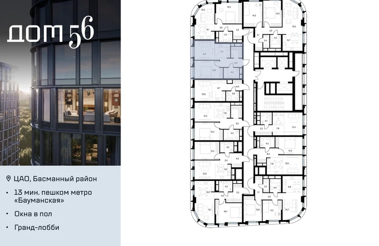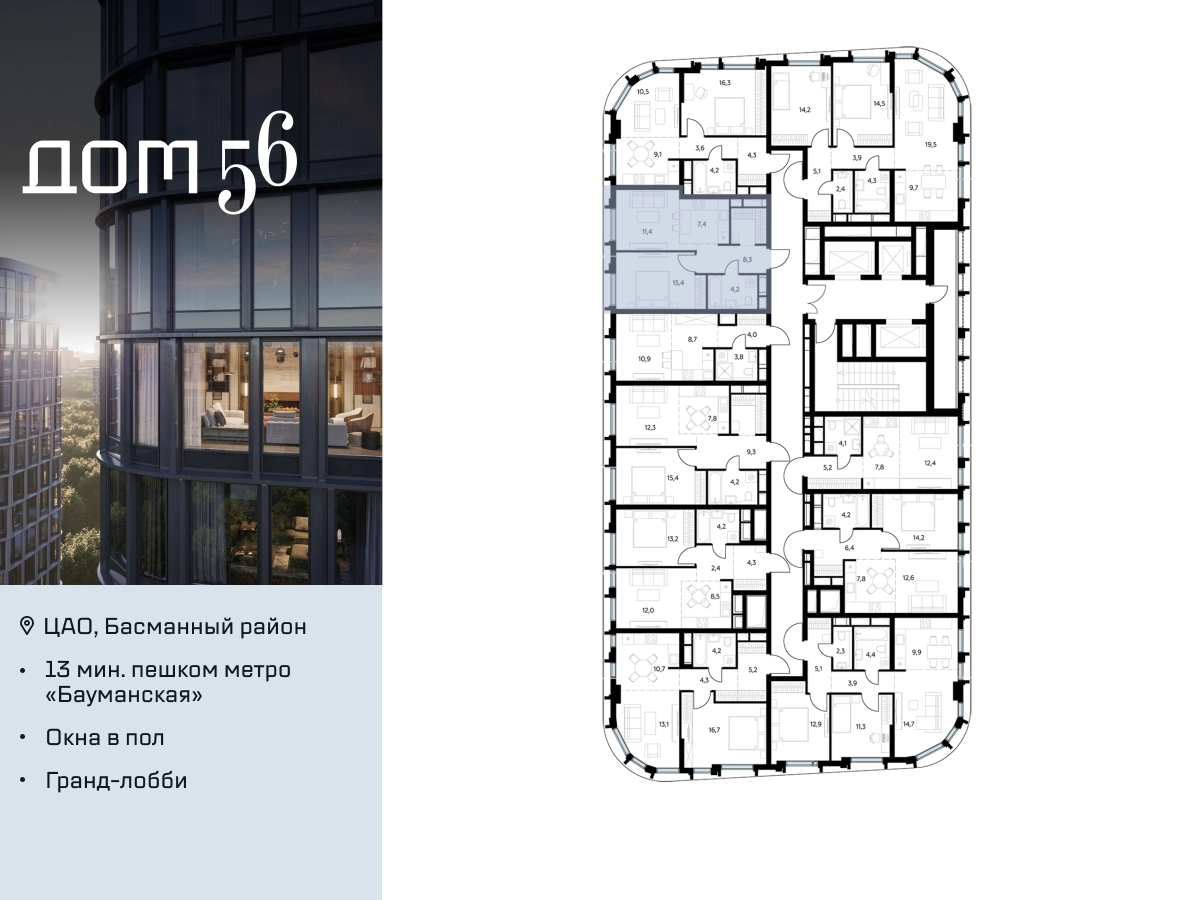 В премиум-квартале «Дом 56» на Бауманской напрямую от девелопера ГК «Галс-Девелопмент» представлена 1-комнатная квартира на 20 этаже общей площадью 46.70 м². Квартира предлагается без отделки, со свободной планировкой. Пространство позволяет воплотить дизайн - проект в соответствии с Вашими предпочтениями. «Дом 56» — расположен в Басманном районе на ул. Фридриха Энгельса, всего в 12-15 минутах пешком от станций метро «Бауманская» и «Электрозаводская». Рядом с премиум-кварталом находятся важные городские магистрали — ТТК, набережная реки Яузы и Бакунинская улица, переходящая в Спартаковскую и Маросейку. Архитектурный стиль «Дома 56» — параметрический минимализм. Футуристические фасады квартала с «эффектом закручивания» словно вращаются вокруг своей оси. Динамичный образ башен дополняет эффектное остекление — окна в пол будут в каждой квартире. «Дом 56» станет органичным продолжением современной научно-креативной среды Басманного района: — Развитое окружение — десятки различных точек притяжения; — Близость престижных вузов: МГТУ, МЭИ и Британская высшая школа дизайна; — Соседство с Технологической долиной и всем необходимым для запуска стартапа; — Набережные и парки для спорта и отдыха. «Дом 56» оснащён первоклассными инженерными системами. Входы на территорию, в здание и паркинг оборудованы системой контроля и управления доступом. С любого этажа в лобби и паркинг спускаются быстрые и бесшумные лифты премиального бренда. Во внутреннем приватном дворе будет создано пространство в бионическом стиле с лаунж-зонами, подвесными качелями, детскими плейхабами для разных возрастов, площадками для спорта и отдыха в окружении зелени. На двух подземных уровнях предусмотрен подземный паркинг и кладовые помещения.О застройщике