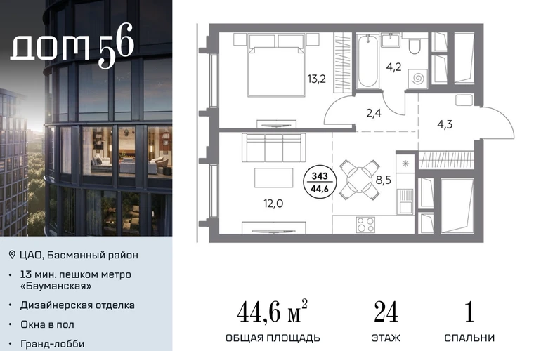В премиум-квартале «Дом 56» на Бауманской напрямую от девелопера ГК «Галс-Девелопмент» представлена 1-комнатная квартира на 24 этаже общей площадью 44.60 м². Квартира предлагается без отделки, со свободной планировкой. Пространство позволяет воплотить дизайн - проект в соответствии с Вашими предпочтениями. «Дом 56» — расположен в Басманном районе на ул. Фридриха Энгельса, всего в 12-15 минутах пешком от станций метро «Бауманская» и «Электрозаводская». Рядом с премиум-кварталом находятся важные городские магистрали — ТТК, набережная реки Яузы и Бакунинская улица, переходящая в Спартаковскую и Маросейку. Архитектурный стиль «Дома 56» — параметрический минимализм. Футуристические фасады квартала с «эффектом закручивания» словно вращаются вокруг своей оси. Динамичный образ башен дополняет эффектное остекление — окна в пол будут в каждой квартире. «Дом 56» станет органичным продолжением современной научно-креативной среды Басманного района: — Развитое окружение — десятки различных точек притяжения; — Близость престижных вузов: МГТУ, МЭИ и Британская высшая школа дизайна; — Соседство с Технологической долиной и всем необходимым для запуска стартапа; — Набережные и парки для спорта и отдыха. «Дом 56» оснащён первоклассными инженерными системами. Входы на территорию, в здание и паркинг оборудованы системой контроля и управления доступом. С любого этажа в лобби и паркинг спускаются быстрые и бесшумные лифты премиального бренда. Во внутреннем приватном дворе будет создано пространство в бионическом стиле с лаунж-зонами, подвесными качелями, детскими плейхабами для разных возрастов, площадками для спорта и отдыха в окружении зелени. На двух подземных уровнях предусмотрен подземный паркинг и кладовые помещения.О застройщике