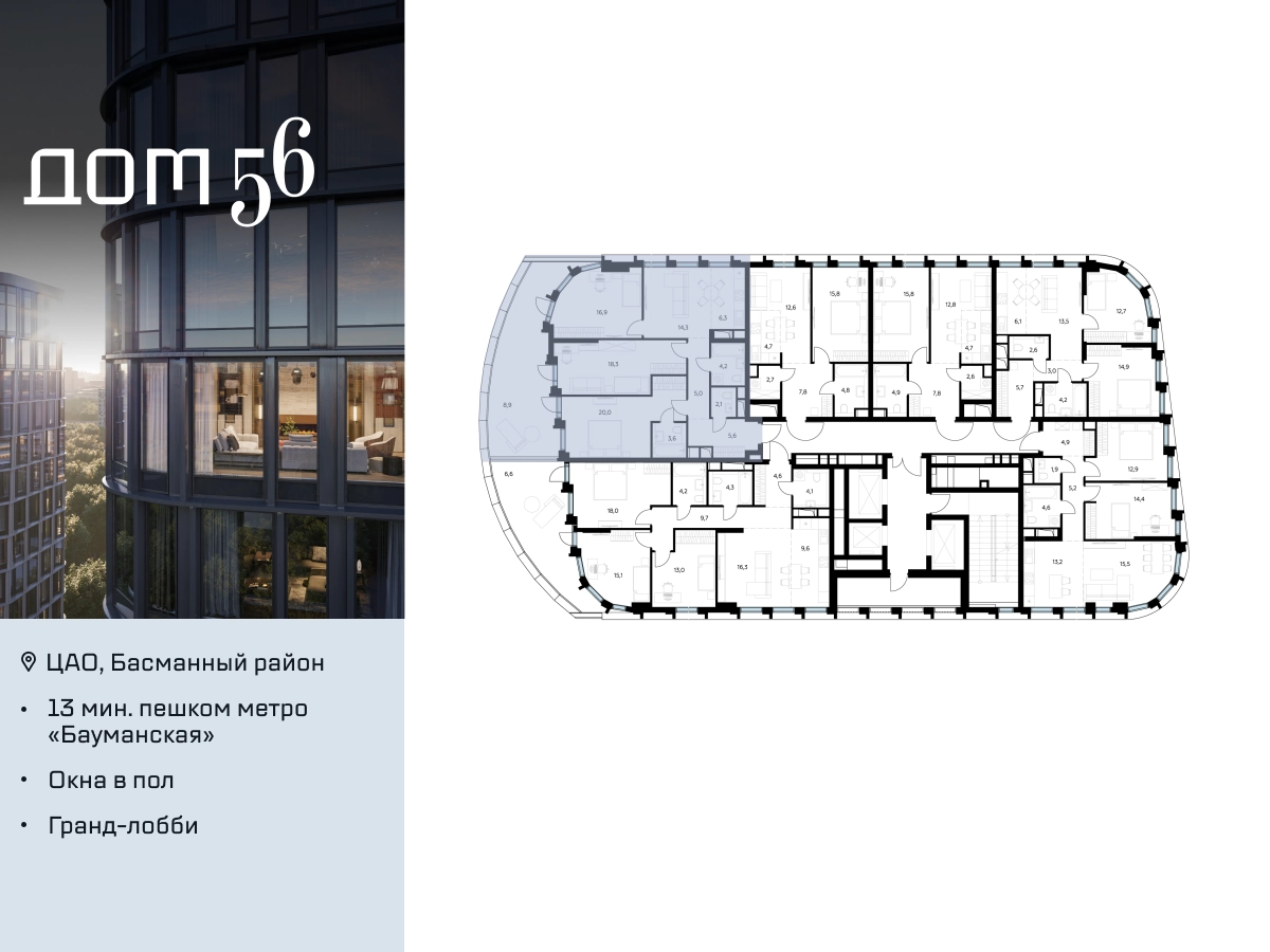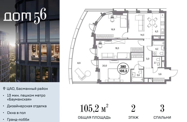 В премиум-квартале «Дом 56» на Бауманской напрямую от девелопера ГК «Галс-Девелопмент» представлена 3-комнатная квартира на 2 этаже общей площадью 105.20 м². Квартира предлагается без отделки, со свободной планировкой. Пространство позволяет воплотить дизайн - проект в соответствии с Вашими предпочтениями. «Дом 56» — расположен в Басманном районе на ул. Фридриха Энгельса, всего в 12-15 минутах пешком от станций метро «Бауманская» и «Электрозаводская». Рядом с премиум-кварталом находятся важные городские магистрали — ТТК, набережная реки Яузы и Бакунинская улица, переходящая в Спартаковскую и Маросейку. Архитектурный стиль «Дома 56» — параметрический минимализм. Футуристические фасады квартала с «эффектом закручивания» словно вращаются вокруг своей оси. Динамичный образ башен дополняет эффектное остекление — окна в пол будут в каждой квартире. «Дом 56» станет органичным продолжением современной научно-креативной среды Басманного района: — Развитое окружение — десятки различных точек притяжения; — Близость престижных вузов: МГТУ, МЭИ и Британская высшая школа дизайна; — Соседство с Технологической долиной и всем необходимым для запуска стартапа; — Набережные и парки для спорта и отдыха. «Дом 56» оснащён первоклассными инженерными системами. Входы на территорию, в здание и паркинг оборудованы системой контроля и управления доступом. С любого этажа в лобби и паркинг спускаются быстрые и бесшумные лифты премиального бренда. Во внутреннем приватном дворе будет создано пространство в бионическом стиле с лаунж-зонами, подвесными качелями, детскими плейхабами для разных возрастов, площадками для спорта и отдыха в окружении зелени. На двух подземных уровнях предусмотрен подземный паркинг и кладовые помещения.О застройщике