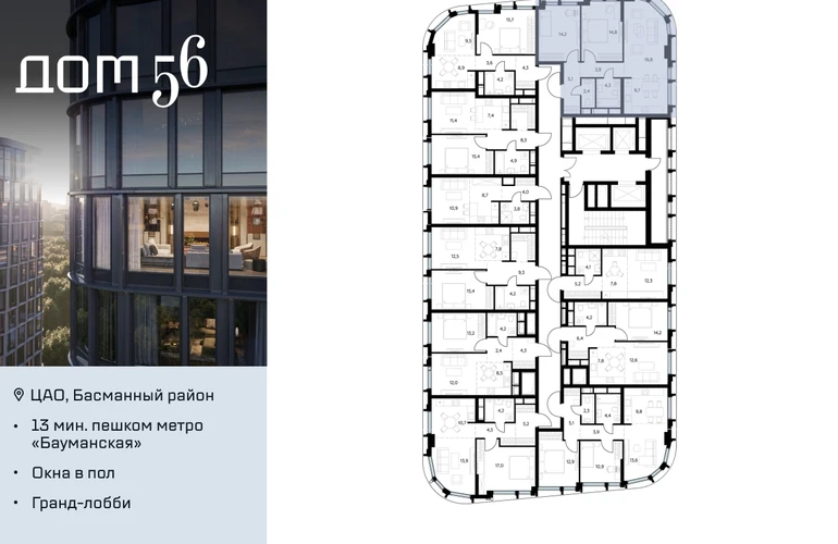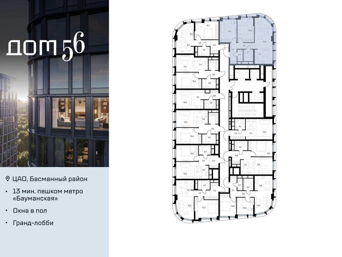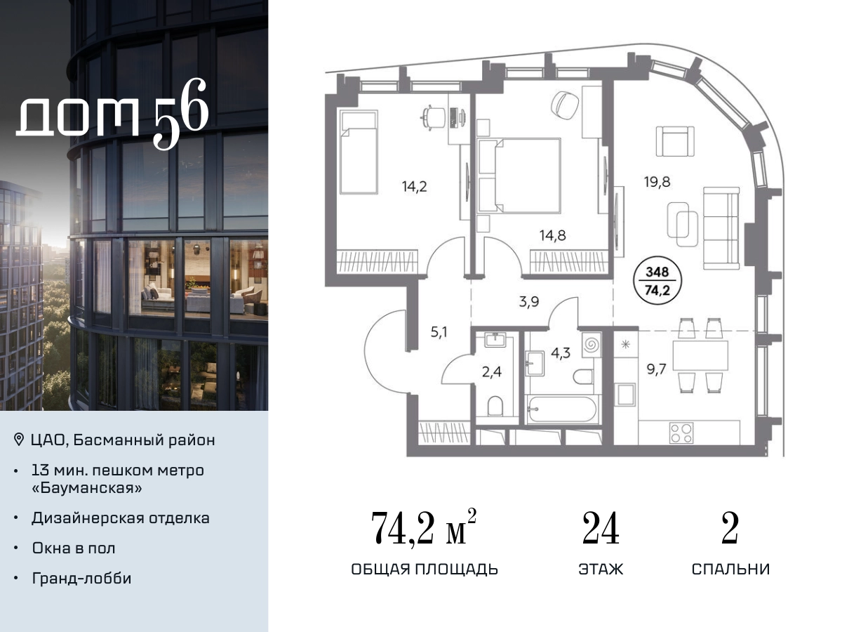 В премиум-квартале «Дом 56» на Бауманской напрямую от девелопера ГК «Галс-Девелопмент» представлена 2-комнатная квартира на 24 этаже общей площадью 74.20 м². Квартира предлагается без отделки, со свободной планировкой. Пространство позволяет воплотить дизайн - проект в соответствии с Вашими предпочтениями. «Дом 56» — расположен в Басманном районе на ул. Фридриха Энгельса, всего в 12-15 минутах пешком от станций метро «Бауманская» и «Электрозаводская». Рядом с премиум-кварталом находятся важные городские магистрали — ТТК, набережная реки Яузы и Бакунинская улица, переходящая в Спартаковскую и Маросейку. Архитектурный стиль «Дома 56» — параметрический минимализм. Футуристические фасады квартала с «эффектом закручивания» словно вращаются вокруг своей оси. Динамичный образ башен дополняет эффектное остекление — окна в пол будут в каждой квартире. «Дом 56» станет органичным продолжением современной научно-креативной среды Басманного района: — Развитое окружение — десятки различных точек притяжения; — Близость престижных вузов: МГТУ, МЭИ и Британская высшая школа дизайна; — Соседство с Технологической долиной и всем необходимым для запуска стартапа; — Набережные и парки для спорта и отдыха. «Дом 56» оснащён первоклассными инженерными системами. Входы на территорию, в здание и паркинг оборудованы системой контроля и управления доступом. С любого этажа в лобби и паркинг спускаются быстрые и бесшумные лифты премиального бренда. Во внутреннем приватном дворе будет создано пространство в бионическом стиле с лаунж-зонами, подвесными качелями, детскими плейхабами для разных возрастов, площадками для спорта и отдыха в окружении зелени. На двух подземных уровнях предусмотрен подземный паркинг и кладовые помещения.О застройщике