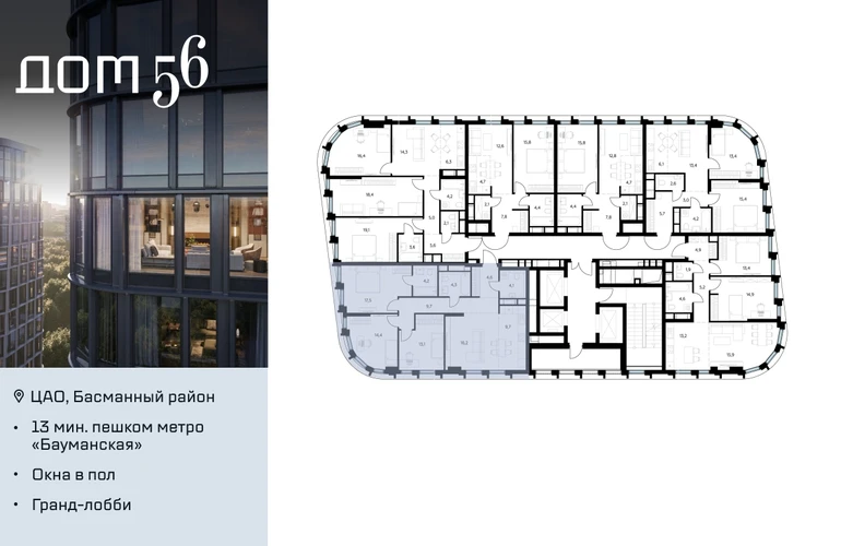 В премиум-квартале «Дом 56» на Бауманской напрямую от девелопера ГК «Галс-Девелопмент» представлена 3-комнатная квартира на 3 этаже общей площадью 97.80 м². Квартира предлагается без отделки, со свободной планировкой. Пространство позволяет воплотить дизайн - проект в соответствии с Вашими предпочтениями. «Дом 56» — расположен в Басманном районе на ул. Фридриха Энгельса, всего в 12-15 минутах пешком от станций метро «Бауманская» и «Электрозаводская». Рядом с премиум-кварталом находятся важные городские магистрали — ТТК, набережная реки Яузы и Бакунинская улица, переходящая в Спартаковскую и Маросейку. Архитектурный стиль «Дома 56» — параметрический минимализм. Футуристические фасады квартала с «эффектом закручивания» словно вращаются вокруг своей оси. Динамичный образ башен дополняет эффектное остекление — окна в пол будут в каждой квартире. «Дом 56» станет органичным продолжением современной научно-креативной среды Басманного района: — Развитое окружение — десятки различных точек притяжения; — Близость престижных вузов: МГТУ, МЭИ и Британская высшая школа дизайна; — Соседство с Технологической долиной и всем необходимым для запуска стартапа; — Набережные и парки для спорта и отдыха. «Дом 56» оснащён первоклассными инженерными системами. Входы на территорию, в здание и паркинг оборудованы системой контроля и управления доступом. С любого этажа в лобби и паркинг спускаются быстрые и бесшумные лифты премиального бренда. Во внутреннем приватном дворе будет создано пространство в бионическом стиле с лаунж-зонами, подвесными качелями, детскими плейхабами для разных возрастов, площадками для спорта и отдыха в окружении зелени. На двух подземных уровнях предусмотрен подземный паркинг и кладовые помещения.О застройщике