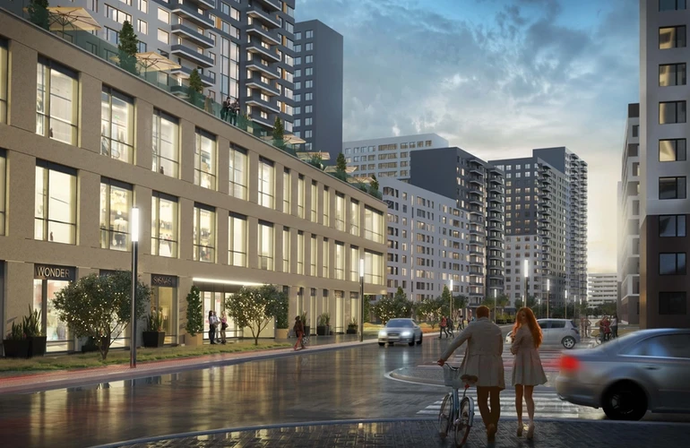 Внутри квартала проектом предусмотрены детские сады, школа, спортивные и игровые зоны. Поблизости — магазины, супермаркеты, аптеки, поликлиники, фитнес-центры. В шаговой доступности расположены парк «Пехорка» и набережная, где можно проводить время на природе.