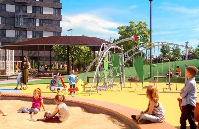 Между корпусами организован двор без машин с газонами, детскими и спортивными площадками под теневыми навесами. Для малышей строят двухэтажный детский сад, а под корпусом размещается подземный паркинг с лифтом на этаж. В шаговой доступности — супермаркет, аптека, кафе и фитнес-центр, безопасность обеспечивают видеонаблюдение и консьерж-сервис.
