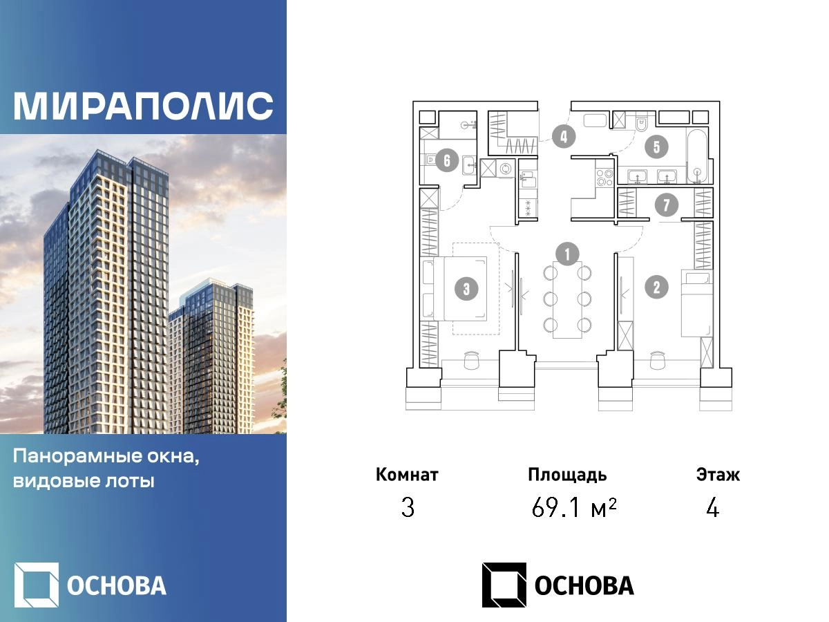 Продаются 3-к апартаменты площадью 69.1 кв.м. на 4-м этаже 33 этажного дома в ЖК "Мираполис" от ГК ОСНОВА. МИРАПОЛИС - проект для тех, кому важно, чтобы под рукой было всё для работы, отдыха и жизни. Проект состоит из четырех башен с авторскими стеклянными фасадами и lounge-rooftop под открытым небом. С высоты птичьего полета резиденты будут наслаждаться видами на город и расположенные рядом парки: "Лосиный остров", "Сокольники", "Ботанический сад", "Сад будущего" и "ВДНХ". МИРАПОЛИС расположен в 3 минутах пешком от МЦК "Ростокино". За 5 минут - можно добраться до ст.м. ВДНХ на машине, а быстрый выезд на главные транспортные магистрали (ТТК и Проспект мира) позволит доехать на личном авто до центра Москвы за полчаса. В просторных лобби с дизайнерской отделкой продуман круглосуточный консьерж-сервис, приватные зоны с мягкой мебелью и комнаты для мытья лап питомцам. Панорамные окна и потолки высотой 3,1 м, а система "умный дом" значительно упростит жизнь резидентам и автоматизирует бытовые процессы. Концептуальный проект предлагает все преимущества бизнес-класса: подземный паркинг, торговый центр и супермаркет, фитнес-клуб, бассейн и SPA, офисы и коворкинги - всё для полноценной и комфортной жизни в столице.О застройщике