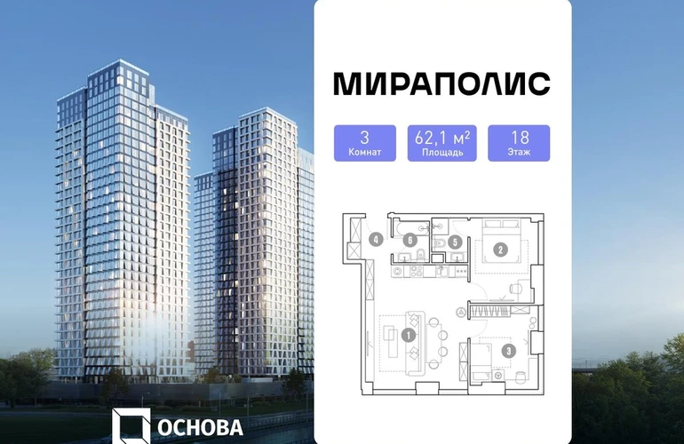 Продаются 3-к апартаменты площадью 62.1 кв.м. на 18-м этаже 33 этажного дома «Мираполис» от ГК ОСНОВА. МИРАПОЛИС – проект для тех, кому важно, чтобы рядом было всё для работы, отдыха и жизни. Проект состоит из четырех башен с авторскими стеклянными фасадами и зоной отдыха под открытым небом. С высоты птичьего полета жители будут наслаждаться видами на город и расположенными рядом парками: «Лосиный остров», «Сокольники», «Ботанический сад», «Сад будущего» и «ВДНХ». МИРАПОЛИС расположен в 3 минутах пешком от МЦК «Ростокино». За 5 минут можно добраться до ст.м. ВДНХ на машине, а быстрый выезд на главные транспортные магистрали (ТТК и Проспект мира) позволит доехать на личном авто до центра Москвы за полчаса. В просторных лобби с дизайнерской отделкой продуман круглосуточный консьерж-сервис, приватные зоны с мягкой мебелью и комнаты для мытья лап питомцам. Панорамное остекление, потолки высотой 3,1 м и система «умный дом» создают современное и комфортное пространство для жизни. Концептуальный проект предлагает все преимущества бизнес-класса: подземный паркинг, торговый центр и супермаркет, фитнес-клуб, бассейн и СПА, офисы и коворкинги - всё для полноценной и комфортной жизни в столице. Монолит готов, высокая стадия готовности. 1 очередь — сдача в 2026 г. Возможна временная регистрация. Подходит как для жизни, так и для инвестиций.О застройщике
