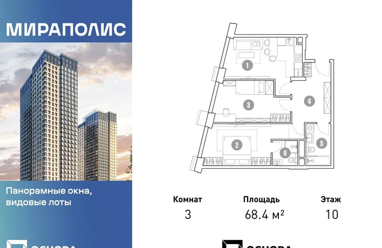 Продаются 4-к апартаменты площадью 68.4 кв.м. на 10-м этаже 33 этажного дома в ЖК "Мираполис" от ГК ОСНОВА. МИРАПОЛИС - проект для тех, кому важно, чтобы под рукой было всё для работы, отдыха и жизни. Проект состоит из четырех башен с авторскими стеклянными фасадами и lounge-rooftop под открытым небом. С высоты птичьего полета резиденты будут наслаждаться видами на город и расположенные рядом парки: "Лосиный остров", "Сокольники", "Ботанический сад", "Сад будущего" и "ВДНХ". МИРАПОЛИС расположен в 3 минутах пешком от МЦК "Ростокино". За 5 минут - можно добраться до ст.м. ВДНХ на машине, а быстрый выезд на главные транспортные магистрали (ТТК и Проспект мира) позволит доехать на личном авто до центра Москвы за полчаса. В просторных лобби с дизайнерской отделкой продуман круглосуточный консьерж-сервис, приватные зоны с мягкой мебелью и комнаты для мытья лап питомцам. Панорамные окна и потолки высотой 3,1 м, а система "умный дом" значительно упростит жизнь резидентам и автоматизирует бытовые процессы. Концептуальный проект предлагает все преимущества бизнес-класса: подземный паркинг, торговый центр и супермаркет, фитнес-клуб, бассейн и SPA, офисы и коворкинги - всё для полноценной и комфортной жизни в столице.О застройщике