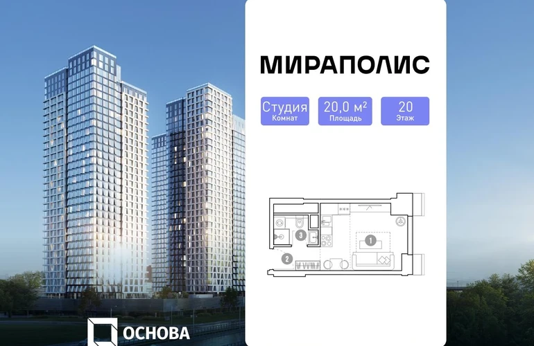 Продается студия площадью 20.0 кв.м. на 20-м этаже 33 этажного дома «Мираполис» от ГК ОСНОВА. МИРАПОЛИС – проект для тех, кому важно, чтобы рядом было всё для работы, отдыха и жизни. Проект состоит из четырех башен с авторскими стеклянными фасадами и зоной отдыха под открытым небом. С высоты птичьего полета жители будут наслаждаться видами на город и расположенными рядом парками: «Лосиный остров», «Сокольники», «Ботанический сад», «Сад будущего» и «ВДНХ». МИРАПОЛИС расположен в 3 минутах пешком от МЦК «Ростокино». За 5 минут можно добраться до ст.м. ВДНХ на машине, а быстрый выезд на главные транспортные магистрали (ТТК и Проспект мира) позволит доехать на личном авто до центра Москвы за полчаса. В просторных лобби с дизайнерской отделкой продуман круглосуточный консьерж-сервис, приватные зоны с мягкой мебелью и комнаты для мытья лап питомцам. Панорамное остекление, потолки высотой 3,1 м и система «умный дом» создают современное и комфортное пространство для жизни. Концептуальный проект предлагает все преимущества бизнес-класса: подземный паркинг, торговый центр и супермаркет, фитнес-клуб, бассейн и СПА, офисы и коворкинги - всё для полноценной и комфортной жизни в столице. Монолит готов, высокая стадия готовности. 1 очередь — сдача в 2026 г. Возможна временная регистрация. Подходит как для жизни, так и для инвестиций.О застройщике
