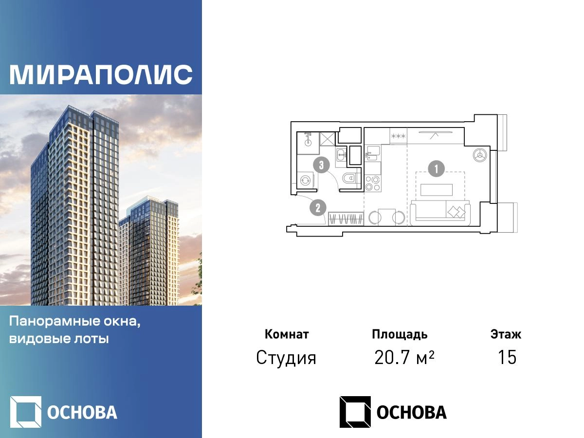 Продается студия площадью 20.7 кв.м. на 15-м этаже 33 этажного дома в ЖК "Мираполис" от ГК ОСНОВА. МИРАПОЛИС - проект для тех, кому важно, чтобы под рукой было всё для работы, отдыха и жизни. Проект состоит из четырех башен с авторскими стеклянными фасадами и lounge-rooftop под открытым небом. С высоты птичьего полета резиденты будут наслаждаться видами на город и расположенные рядом парки: "Лосиный остров", "Сокольники", "Ботанический сад", "Сад будущего" и "ВДНХ". МИРАПОЛИС расположен в 3 минутах пешком от МЦК "Ростокино". За 5 минут - можно добраться до ст.м. ВДНХ на машине, а быстрый выезд на главные транспортные магистрали (ТТК и Проспект мира) позволит доехать на личном авто до центра Москвы за полчаса. В просторных лобби с дизайнерской отделкой продуман круглосуточный консьерж-сервис, приватные зоны с мягкой мебелью и комнаты для мытья лап питомцам. Панорамные окна и потолки высотой 3,1 м, а система "умный дом" значительно упростит жизнь резидентам и автоматизирует бытовые процессы. Концептуальный проект предлагает все преимущества бизнес-класса: подземный паркинг, торговый центр и супермаркет, фитнес-клуб, бассейн и SPA, офисы и коворкинги - всё для полноценной и комфортной жизни в столице.О застройщике