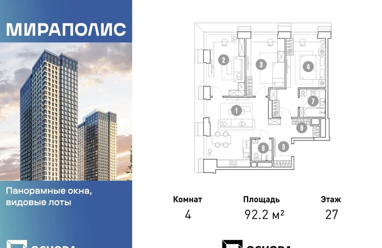 Продаются 4-к апартаменты площадью 92.2 кв.м. на 27-м этаже 33 этажного дома в ЖК "Мираполис" от ГК ОСНОВА. МИРАПОЛИС - проект для тех, кому важно, чтобы под рукой было всё для работы, отдыха и жизни. Проект состоит из четырех башен с авторскими стеклянными фасадами и lounge-rooftop под открытым небом. С высоты птичьего полета резиденты будут наслаждаться видами на город и расположенные рядом парки: "Лосиный остров", "Сокольники", "Ботанический сад", "Сад будущего" и "ВДНХ". МИРАПОЛИС расположен в 3 минутах пешком от МЦК "Ростокино". За 5 минут - можно добраться до ст.м. ВДНХ на машине, а быстрый выезд на главные транспортные магистрали (ТТК и Проспект мира) позволит доехать на личном авто до центра Москвы за полчаса. В просторных лобби с дизайнерской отделкой продуман круглосуточный консьерж-сервис, приватные зоны с мягкой мебелью и комнаты для мытья лап питомцам. Панорамные окна и потолки высотой 3,1 м, а система "умный дом" значительно упростит жизнь резидентам и автоматизирует бытовые процессы. Концептуальный проект предлагает все преимущества бизнес-класса: подземный паркинг, торговый центр и супермаркет, фитнес-клуб, бассейн и SPA, офисы и коворкинги - всё для полноценной и комфортной жизни в столице.О застройщике