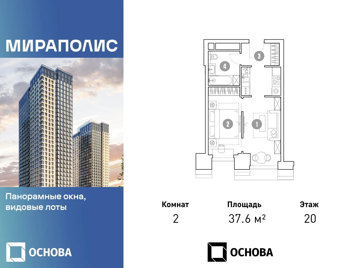 Продаются 2-к апартаменты площадью 37.6 кв.м. на 20-м этаже 33 этажного дома «Мираполис» от ГК ОСНОВА. МИРАПОЛИС – проект для тех, кому важно, чтобы рядом было всё для работы, отдыха и жизни. Проект состоит из четырех башен с авторскими стеклянными фасадами и зоной отдыха под открытым небом. С высоты птичьего полета жители будут наслаждаться видами на город и расположенными рядом парками: «Лосиный остров», «Сокольники», «Ботанический сад», «Сад будущего» и «ВДНХ». МИРАПОЛИС расположен в 3 минутах пешком от МЦК «Ростокино». За 5 минут можно добраться до ст.м. ВДНХ на машине, а быстрый выезд на главные транспортные магистрали (ТТК и Проспект мира) позволит доехать на личном авто до центра Москвы за полчаса. В просторных лобби с дизайнерской отделкой продуман круглосуточный консьерж-сервис, приватные зоны с мягкой мебелью и комнаты для мытья лап питомцам. Панорамное остекление, потолки высотой 3,1 м и система «умный дом» создают современное и комфортное пространство для жизни. Концептуальный проект предлагает все преимущества бизнес-класса: подземный паркинг, торговый центр и супермаркет, фитнес-клуб, бассейн и СПА, офисы и коворкинги - всё для полноценной и комфортной жизни в столице. Монолит готов, высокая стадия готовности. 1 очередь — сдача в 2026 г. Возможна временная регистрация. Подходит как для жизни, так и для инвестиций.О застройщике