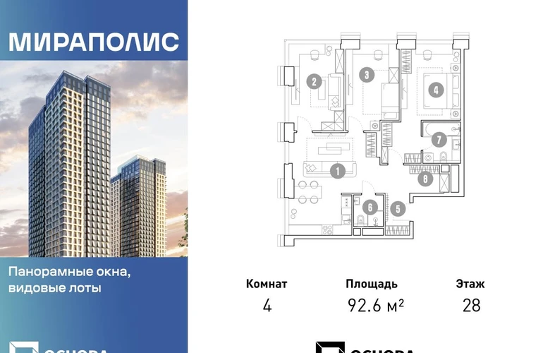 Продаются 4-к апартаменты площадью 92.6 кв.м. на 28-м этаже 33 этажного дома в ЖК "Мираполис" от ГК ОСНОВА. МИРАПОЛИС - проект для тех, кому важно, чтобы под рукой было всё для работы, отдыха и жизни. Проект состоит из четырех башен с авторскими стеклянными фасадами и lounge-rooftop под открытым небом. С высоты птичьего полета резиденты будут наслаждаться видами на город и расположенные рядом парки: "Лосиный остров", "Сокольники", "Ботанический сад", "Сад будущего" и "ВДНХ". МИРАПОЛИС расположен в 3 минутах пешком от МЦК "Ростокино". За 5 минут - можно добраться до ст.м. ВДНХ на машине, а быстрый выезд на главные транспортные магистрали (ТТК и Проспект мира) позволит доехать на личном авто до центра Москвы за полчаса. В просторных лобби с дизайнерской отделкой продуман круглосуточный консьерж-сервис, приватные зоны с мягкой мебелью и комнаты для мытья лап питомцам. Панорамные окна и потолки высотой 3,1 м, а система "умный дом" значительно упростит жизнь резидентам и автоматизирует бытовые процессы. Концептуальный проект предлагает все преимущества бизнес-класса: подземный паркинг, торговый центр и супермаркет, фитнес-клуб, бассейн и SPA, офисы и коворкинги - всё для полноценной и комфортной жизни в столице.О застройщике