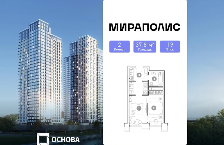 Продаются 2-к апартаменты площадью 37.8 кв.м. на 19-м этаже 33 этажного дома «Мираполис» от ГК ОСНОВА. МИРАПОЛИС – проект для тех, кому важно, чтобы рядом было всё для работы, отдыха и жизни. Проект состоит из четырех башен с авторскими стеклянными фасадами и зоной отдыха под открытым небом. С высоты птичьего полета жители будут наслаждаться видами на город и расположенными рядом парками: «Лосиный остров», «Сокольники», «Ботанический сад», «Сад будущего» и «ВДНХ». МИРАПОЛИС расположен в 3 минутах пешком от МЦК «Ростокино». За 5 минут можно добраться до ст.м. ВДНХ на машине, а быстрый выезд на главные транспортные магистрали (ТТК и Проспект мира) позволит доехать на личном авто до центра Москвы за полчаса. В просторных лобби с дизайнерской отделкой продуман круглосуточный консьерж-сервис, приватные зоны с мягкой мебелью и комнаты для мытья лап питомцам. Панорамное остекление, потолки высотой 3,1 м и система «умный дом» создают современное и комфортное пространство для жизни. Концептуальный проект предлагает все преимущества бизнес-класса: подземный паркинг, торговый центр и супермаркет, фитнес-клуб, бассейн и СПА, офисы и коворкинги - всё для полноценной и комфортной жизни в столице. Монолит готов, высокая стадия готовности. 1 очередь — сдача в 2026 г. Возможна временная регистрация. Подходит как для жизни, так и для инвестиций.О застройщике