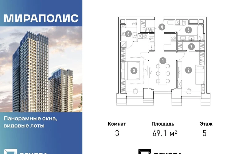Продаются 3-к апартаменты площадью 69.1 кв.м. на 5-м этаже 33 этажного дома в ЖК "Мираполис" от ГК ОСНОВА. МИРАПОЛИС - проект для тех, кому важно, чтобы под рукой было всё для работы, отдыха и жизни. Проект состоит из четырех башен с авторскими стеклянными фасадами и lounge-rooftop под открытым небом. С высоты птичьего полета резиденты будут наслаждаться видами на город и расположенные рядом парки: "Лосиный остров", "Сокольники", "Ботанический сад", "Сад будущего" и "ВДНХ". МИРАПОЛИС расположен в 3 минутах пешком от МЦК "Ростокино". За 5 минут - можно добраться до ст.м. ВДНХ на машине, а быстрый выезд на главные транспортные магистрали (ТТК и Проспект мира) позволит доехать на личном авто до центра Москвы за полчаса. В просторных лобби с дизайнерской отделкой продуман круглосуточный консьерж-сервис, приватные зоны с мягкой мебелью и комнаты для мытья лап питомцам. Панорамные окна и потолки высотой 3,1 м, а система "умный дом" значительно упростит жизнь резидентам и автоматизирует бытовые процессы. Концептуальный проект предлагает все преимущества бизнес-класса: подземный паркинг, торговый центр и супермаркет, фитнес-клуб, бассейн и SPA, офисы и коворкинги - всё для полноценной и комфортной жизни в столице.О застройщике