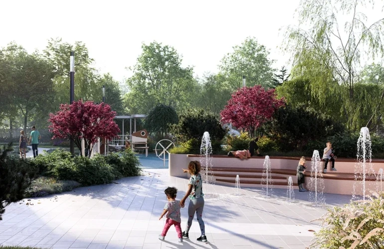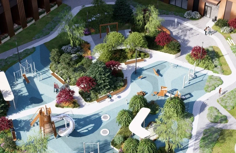 Внутри — лобби с круглосуточным сервисом, коворкинги и лаунж-пространства, почтовые комнаты, веломеста и зоны для мытья лап питомцев. Двор с амфитеатром, фонтаном, игровыми и спортивными площадками спроектирован в курортной стилистике. В перспективе на набережной запланированы спортцентр и речное такси; вокруг — детсады, школы, фитнес и медучреждения шаговой доступности.