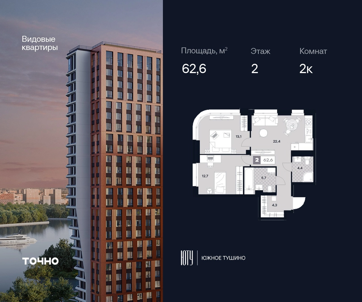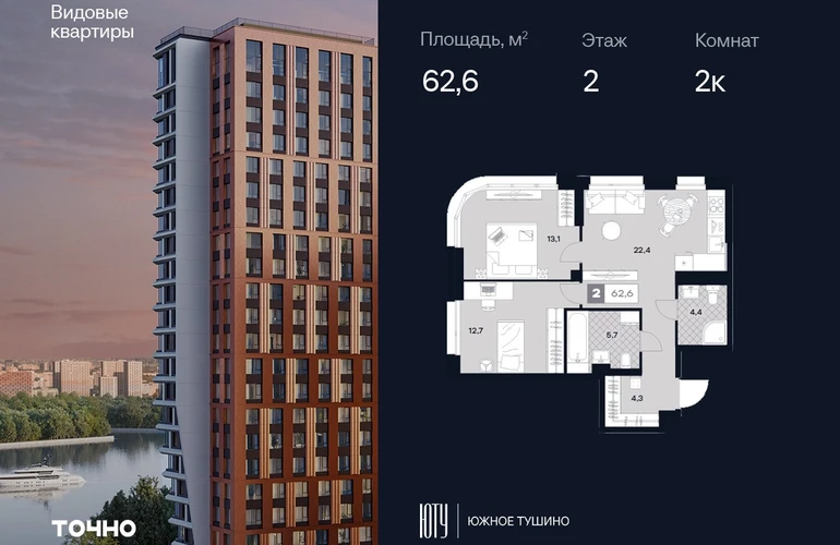 ЮТУ-камерные небоскребы бизнес-класса с исключительной архитектурой, видовыми квартирами и подходом к большой воде-благоустроенной набережной канала имени Москвы. Проект ЮТУ создает идеальный баланс жизни в городе. Это приватный оазис, где в любой момент можно сменить контекст и выбрать любой из тысячи маршрутов к активному отдыху и ярким впечатлениям. Локация премиум-класса • Первая линии в прибрежной части Химкинского водохранилища • Исключительно тихий и зелёный район Южное Тушино • За 2 минуты можно спуститься к воде, за 10 минут найти зеленые парки и готовую инфраструктуру, за 30 минут доехать до Кремля Концепция проекта • Две футуристичные башни, соединенные торговой галереей от бюро ATRIUM • 60 неповторяющихся планировок: квартиры с угловым «плавным» панорамным остеклением, мастер-спальнями и гостиными до 39м² и просто очень большие квартиры площадью до 128,6 м² • Беспрецедентная коллекция видов-в проекте 80 % видовых квартир Чувство эксклюзивности • Своя приватная жилая экосистема -только для резидентов домов • Лаунж-терраса на крыше • Пространство скрыто от посторонних глаз-с трех сторон его окружают строения проекта Прогрессивные технологии • 3-уровневая система безопасности (Face ID, BLE-метки, видеонаблюдение) • Умный паркинг с распознаванием номеров Проект федерального девелопера ТОЧНО-из ТОП-3 застройщиков России. Компания в проекте реализует ответственный подход к развитию пространств для благополучной жизни человека. И что в ЮТУ особенное воплощение приобретает концепция человекоцентричности, как заметная грань девелопмента ТОЧНО.