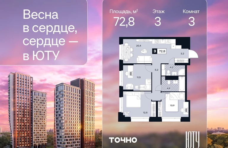 ЮТУ-камерные небоскребы бизнес-класса с исключительной архитектурой, видовыми квартирами и подходом к большой воде-благоустроенной набережной канала имени Москвы. Проект ЮТУ создает идеальный баланс жизни в городе. Это приватный оазис, где в любой момент можно сменить контекст и выбрать любой из тысячи маршрутов к активному отдыху и ярким впечатлениям. Локация премиум-класса • Первая линии в прибрежной части Химкинского водохранилища • Исключительно тихий и зелёный район Южное Тушино • За 2 минуты можно спуститься к воде, за 10 минут найти зеленые парки и готовую инфраструктуру, за 30 минут доехать до Кремля Концепция проекта • Две футуристичные башни, соединенные торговой галереей от бюро ATRIUM • 60 неповторяющихся планировок: квартиры с угловым «плавным» панорамным остеклением, мастер-спальнями и гостиными до 39м² и просто очень большие квартиры площадью до 128,6 м² • Беспрецедентная коллекция видов-в проекте 80 % видовых квартир Чувство эксклюзивности • Своя приватная жилая экосистема -только для резидентов домов • Лаунж-терраса на крыше • Пространство скрыто от посторонних глаз-с трех сторон его окружают строения проекта Прогрессивные технологии • 3-уровневая система безопасности (Face ID, BLE-метки, видеонаблюдение) • Умный паркинг с распознаванием номеров Проект федерального девелопера ТОЧНО-из ТОП-3 застройщиков России. Компания в проекте реализует ответственный подход к развитию пространств для благополучной жизни человека. И что в ЮТУ особенное воплощение приобретает концепция человекоцентричности, как заметная грань девелопмента ТОЧНО.