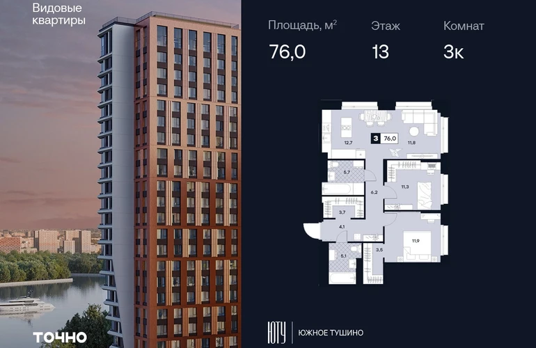 ЮТУ-камерные небоскребы бизнес-класса с исключительной архитектурой, видовыми квартирами и подходом к большой воде-благоустроенной набережной канала имени Москвы. Проект ЮТУ создает идеальный баланс жизни в городе. Это приватный оазис, где в любой момент можно сменить контекст и выбрать любой из тысячи маршрутов к активному отдыху и ярким впечатлениям. Локация премиум-класса • Первая линии в прибрежной части Химкинского водохранилища • Исключительно тихий и зелёный район Южное Тушино • За 2 минуты можно спуститься к воде, за 10 минут найти зеленые парки и готовую инфраструктуру, за 30 минут доехать до Кремля Концепция проекта • Две футуристичные башни, соединенные торговой галереей от бюро ATRIUM • 60 неповторяющихся планировок: квартиры с угловым «плавным» панорамным остеклением, мастер-спальнями и гостиными до 39м² и просто очень большие квартиры площадью до 128,6 м² • Беспрецедентная коллекция видов-в проекте 80 % видовых квартир Чувство эксклюзивности • Своя приватная жилая экосистема -только для резидентов домов • Лаунж-терраса на крыше • Пространство скрыто от посторонних глаз-с трех сторон его окружают строения проекта Прогрессивные технологии • 3-уровневая система безопасности (Face ID, BLE-метки, видеонаблюдение) • Умный паркинг с распознаванием номеров Проект федерального девелопера ТОЧНО-из ТОП-3 застройщиков России. Компания в проекте реализует ответственный подход к развитию пространств для благополучной жизни человека. И что в ЮТУ особенное воплощение приобретает концепция человекоцентричности, как заметная грань девелопмента ТОЧНО.