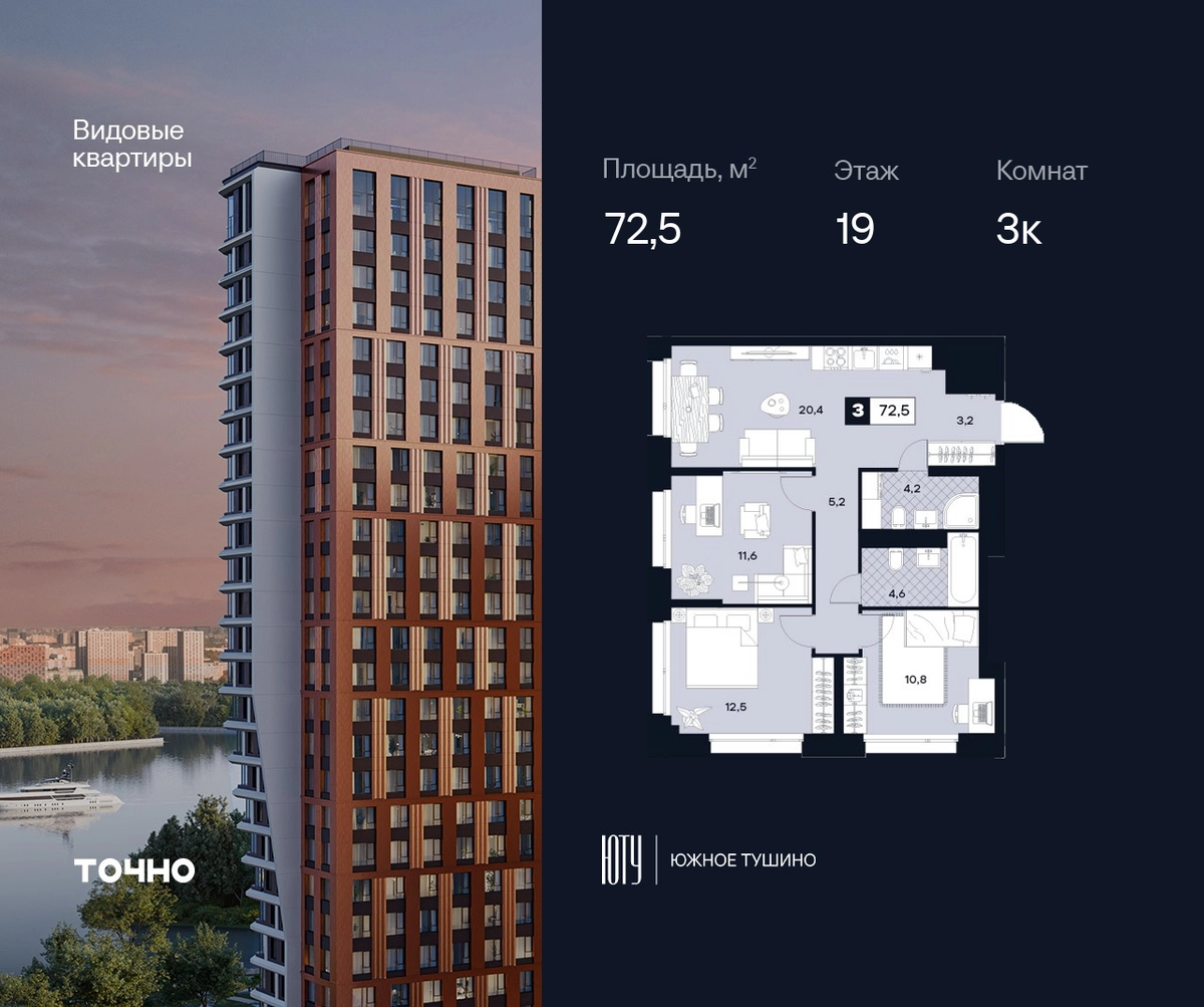 ЮТУ-камерные небоскребы бизнес-класса с исключительной архитектурой, видовыми квартирами и подходом к большой воде-благоустроенной набережной канала имени Москвы. Проект ЮТУ создает идеальный баланс жизни в городе. Это приватный оазис, где в любой момент можно сменить контекст и выбрать любой из тысячи маршрутов к активному отдыху и ярким впечатлениям. Локация премиум-класса • Первая линии в прибрежной части Химкинского водохранилища • Исключительно тихий и зелёный район Южное Тушино • За 2 минуты можно спуститься к воде, за 10 минут найти зеленые парки и готовую инфраструктуру, за 30 минут доехать до Кремля Концепция проекта • Две футуристичные башни, соединенные торговой галереей от бюро ATRIUM • 60 неповторяющихся планировок: квартиры с угловым «плавным» панорамным остеклением, мастер-спальнями и гостиными до 39м² и просто очень большие квартиры площадью до 128,6 м² • Беспрецедентная коллекция видов-в проекте 80 % видовых квартир Чувство эксклюзивности • Своя приватная жилая экосистема -только для резидентов домов • Лаунж-терраса на крыше • Пространство скрыто от посторонних глаз-с трех сторон его окружают строения проекта Прогрессивные технологии • 3-уровневая система безопасности (Face ID, BLE-метки, видеонаблюдение) • Умный паркинг с распознаванием номеров Проект федерального девелопера ТОЧНО-из ТОП-3 застройщиков России. Компания в проекте реализует ответственный подход к развитию пространств для благополучной жизни человека. И что в ЮТУ особенное воплощение приобретает концепция человекоцентричности, как заметная грань девелопмента ТОЧНО.