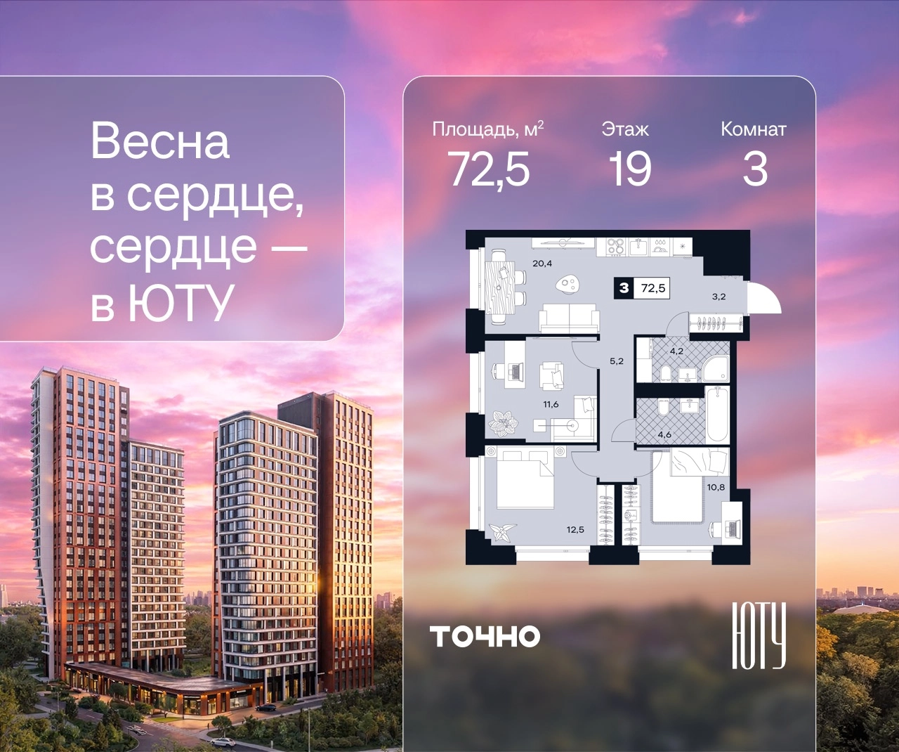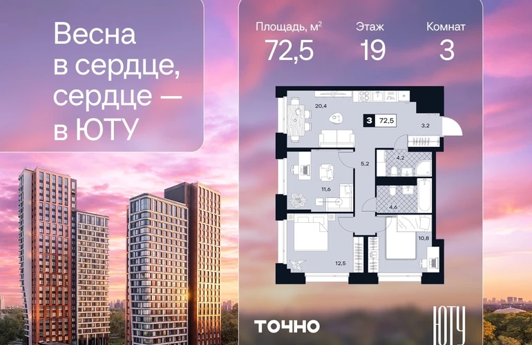 ЮТУ-камерные небоскребы бизнес-класса с исключительной архитектурой, видовыми квартирами и подходом к большой воде-благоустроенной набережной канала имени Москвы. Проект ЮТУ создает идеальный баланс жизни в городе. Это приватный оазис, где в любой момент можно сменить контекст и выбрать любой из тысячи маршрутов к активному отдыху и ярким впечатлениям. Локация премиум-класса • Первая линии в прибрежной части Химкинского водохранилища • Исключительно тихий и зелёный район Южное Тушино • За 2 минуты можно спуститься к воде, за 10 минут найти зеленые парки и готовую инфраструктуру, за 30 минут доехать до Кремля Концепция проекта • Две футуристичные башни, соединенные торговой галереей от бюро ATRIUM • 60 неповторяющихся планировок: квартиры с угловым «плавным» панорамным остеклением, мастер-спальнями и гостиными до 39м² и просто очень большие квартиры площадью до 128,6 м² • Беспрецедентная коллекция видов-в проекте 80 % видовых квартир Чувство эксклюзивности • Своя приватная жилая экосистема -только для резидентов домов • Лаунж-терраса на крыше • Пространство скрыто от посторонних глаз-с трех сторон его окружают строения проекта Прогрессивные технологии • 3-уровневая система безопасности (Face ID, BLE-метки, видеонаблюдение) • Умный паркинг с распознаванием номеров Проект федерального девелопера ТОЧНО-из ТОП-3 застройщиков России. Компания в проекте реализует ответственный подход к развитию пространств для благополучной жизни человека. И что в ЮТУ особенное воплощение приобретает концепция человекоцентричности, как заметная грань девелопмента ТОЧНО.
