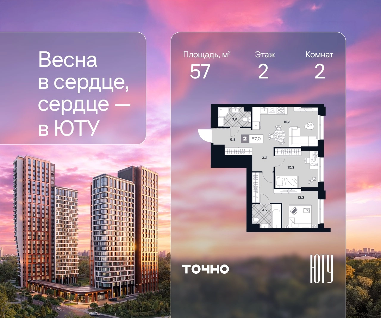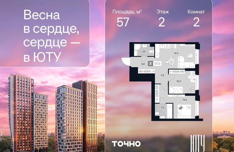 ЮТУ-камерные небоскребы бизнес-класса с исключительной архитектурой, видовыми квартирами и подходом к большой воде-благоустроенной набережной канала имени Москвы. Проект ЮТУ создает идеальный баланс жизни в городе. Это приватный оазис, где в любой момент можно сменить контекст и выбрать любой из тысячи маршрутов к активному отдыху и ярким впечатлениям. Локация премиум-класса • Первая линии в прибрежной части Химкинского водохранилища • Исключительно тихий и зелёный район Южное Тушино • За 2 минуты можно спуститься к воде, за 10 минут найти зеленые парки и готовую инфраструктуру, за 30 минут доехать до Кремля Концепция проекта • Две футуристичные башни, соединенные торговой галереей от бюро ATRIUM • 60 неповторяющихся планировок: квартиры с угловым «плавным» панорамным остеклением, мастер-спальнями и гостиными до 39м² и просто очень большие квартиры площадью до 128,6 м² • Беспрецедентная коллекция видов-в проекте 80 % видовых квартир Чувство эксклюзивности • Своя приватная жилая экосистема -только для резидентов домов • Лаунж-терраса на крыше • Пространство скрыто от посторонних глаз-с трех сторон его окружают строения проекта Прогрессивные технологии • 3-уровневая система безопасности (Face ID, BLE-метки, видеонаблюдение) • Умный паркинг с распознаванием номеров Проект федерального девелопера ТОЧНО-из ТОП-3 застройщиков России. Компания в проекте реализует ответственный подход к развитию пространств для благополучной жизни человека. И что в ЮТУ особенное воплощение приобретает концепция человекоцентричности, как заметная грань девелопмента ТОЧНО.