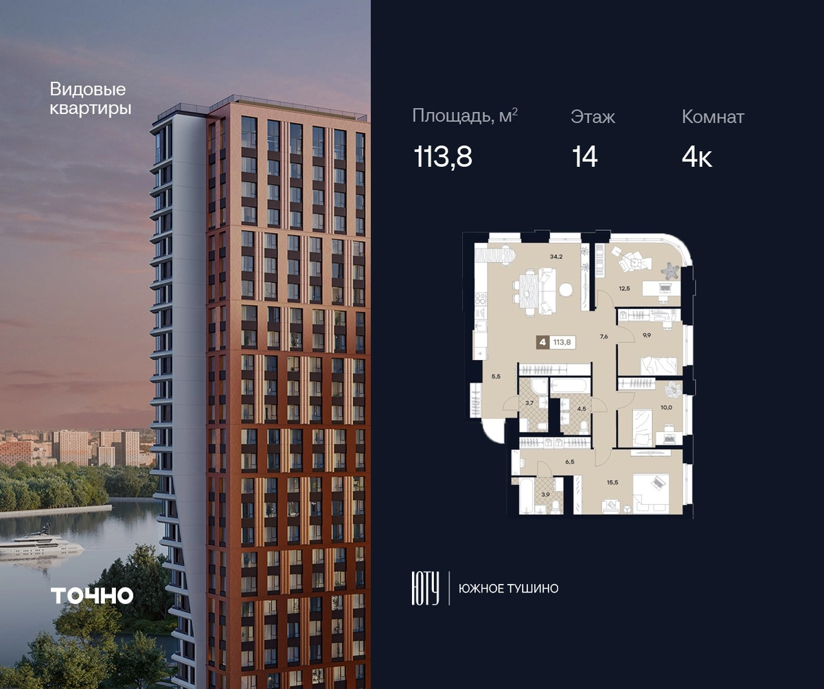 ЮТУ-камерные небоскребы бизнес-класса с исключительной архитектурой, видовыми квартирами и подходом к большой воде-благоустроенной набережной канала имени Москвы. Проект ЮТУ создает идеальный баланс жизни в городе. Это приватный оазис, где в любой момент можно сменить контекст и выбрать любой из тысячи маршрутов к активному отдыху и ярким впечатлениям. Локация премиум-класса • Первая линии в прибрежной части Химкинского водохранилища • Исключительно тихий и зелёный район Южное Тушино • За 2 минуты можно спуститься к воде, за 10 минут найти зеленые парки и готовую инфраструктуру, за 30 минут доехать до Кремля Концепция проекта • Две футуристичные башни, соединенные торговой галереей от бюро ATRIUM • 60 неповторяющихся планировок: квартиры с угловым «плавным» панорамным остеклением, мастер-спальнями и гостиными до 39м² и просто очень большие квартиры площадью до 128,6 м² • Беспрецедентная коллекция видов-в проекте 80 % видовых квартир Чувство эксклюзивности • Своя приватная жилая экосистема -только для резидентов домов • Лаунж-терраса на крыше • Пространство скрыто от посторонних глаз-с трех сторон его окружают строения проекта Прогрессивные технологии • 3-уровневая система безопасности (Face ID, BLE-метки, видеонаблюдение) • Умный паркинг с распознаванием номеров Проект федерального девелопера ТОЧНО-из ТОП-3 застройщиков России. Компания в проекте реализует ответственный подход к развитию пространств для благополучной жизни человека. И что в ЮТУ особенное воплощение приобретает концепция человекоцентричности, как заметная грань девелопмента ТОЧНО.