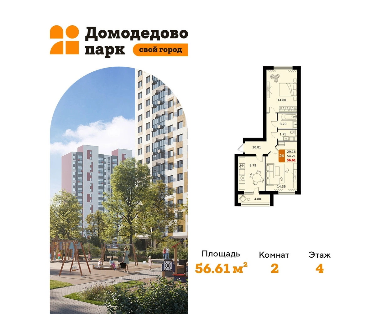 Продается двухкомнатная квартира в жилом комплексе комфорт класса «Домодедово парк» площадью 56.61 кв.м на 4 этаже 17 этажного дома.КВАРТИРЫ: