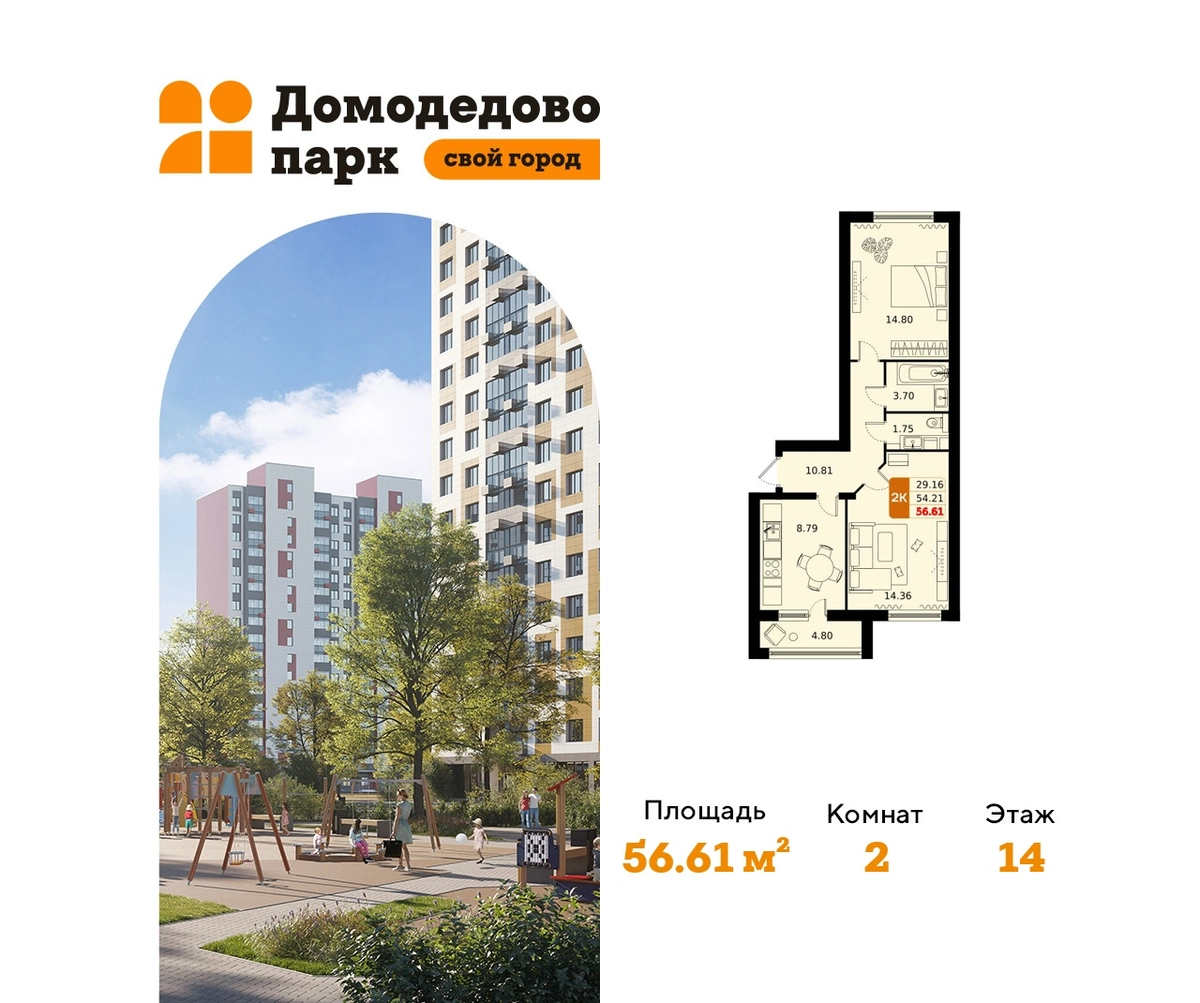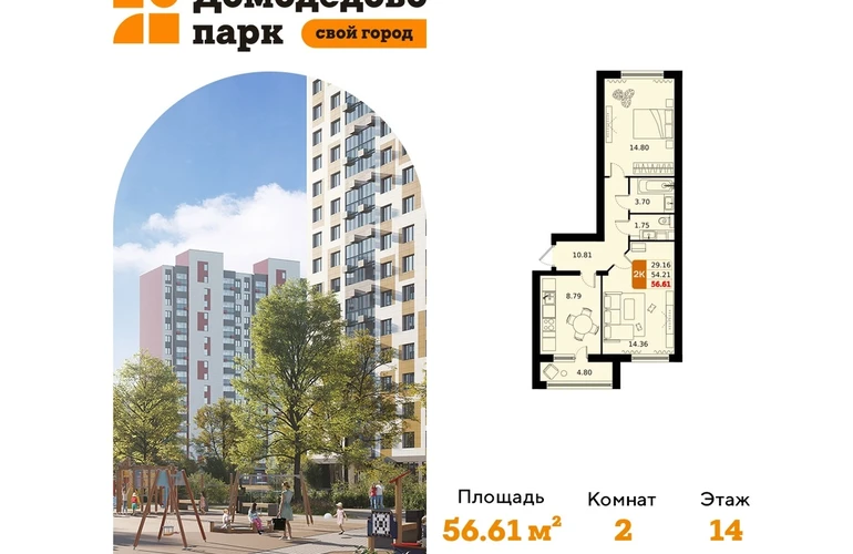 Выгода до 27%. Срок сдачи 2026 год. Продажа напрямую от застройщика в жилом комплексе комфорт класса "Домодедово парк" площадью 56.40 кв.м на 14 этаже 17 этажного дома. Квартира с предчистовой отделкой.Квартиры