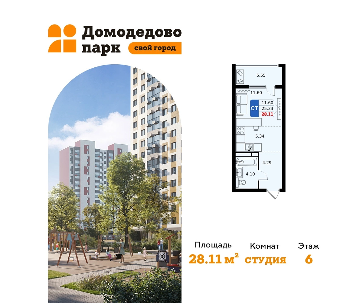 Продается квартира-студия в жилом комплексе комфорт класса «Домодедово парк» площадью 28.11 кв.м на 6 этаже 17 этажного дома.КВАРТИРЫ: