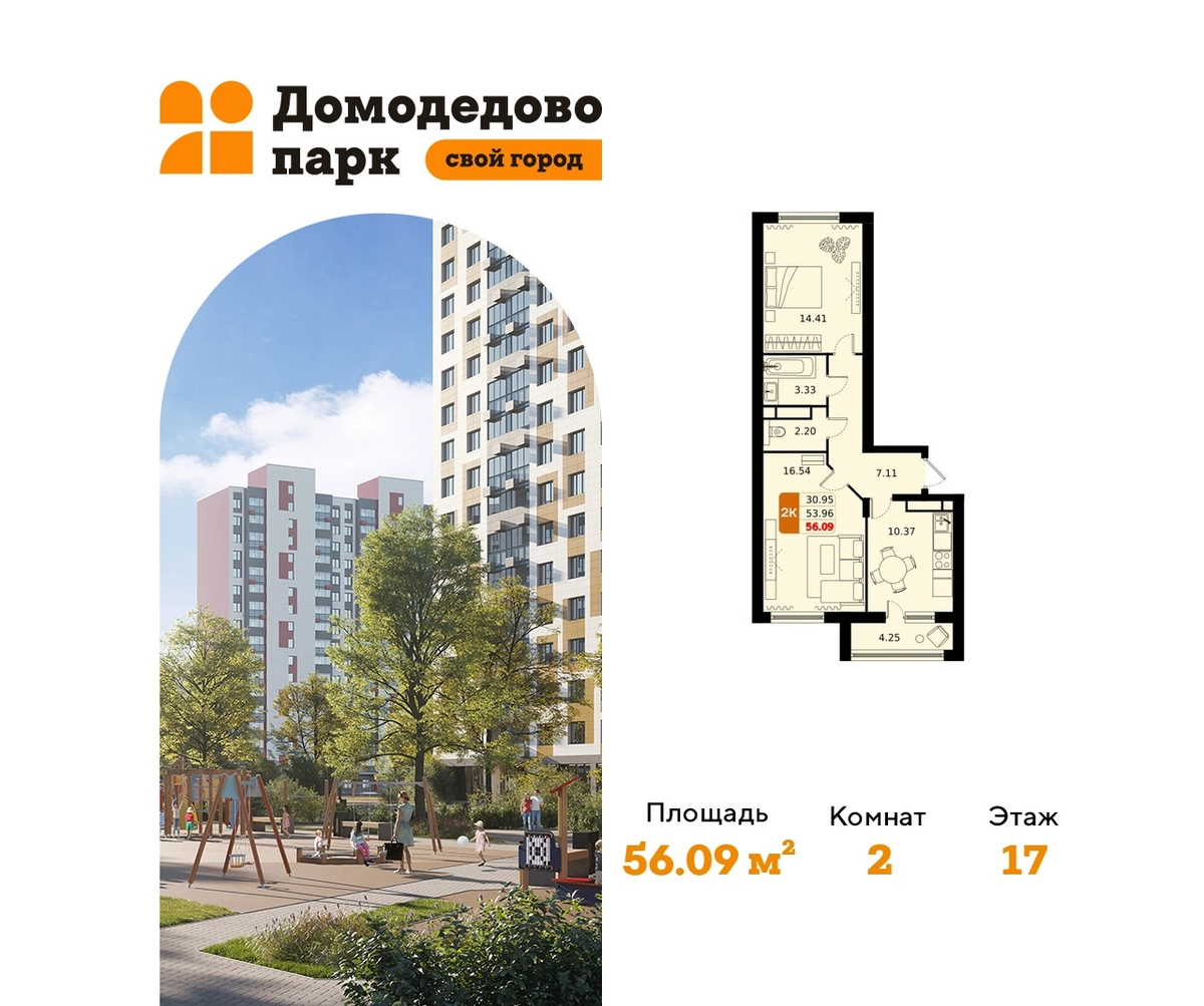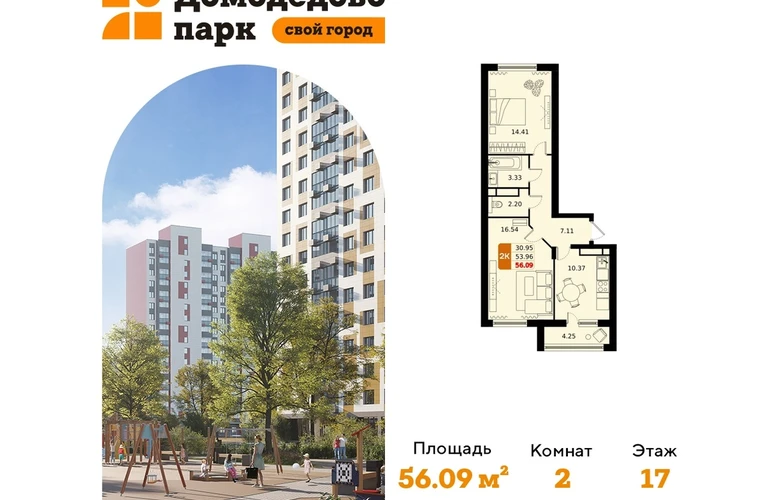 Выгода до 27%. Срок сдачи 2026 год. Продажа напрямую от застройщика в жилом комплексе комфорт класса "Домодедово парк" площадью 56.00 кв.м на 17 этаже 17 этажного дома. Квартира с предчистовой отделкой.Квартиры