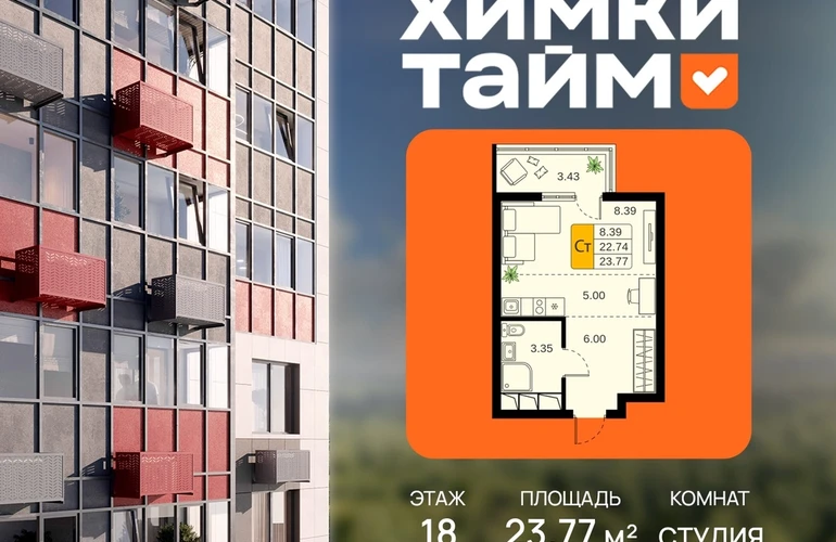 Выгода до 9%. Сдача в 2026 году. Продажа напрямую от застройщика в жилом комплексе комфорт класса "Химки Тайм" площадью 23.77 кв.м на 18 этаже 20 этажного дома.Идеальный выбор для первой квартиры или выгодных инвестиций!