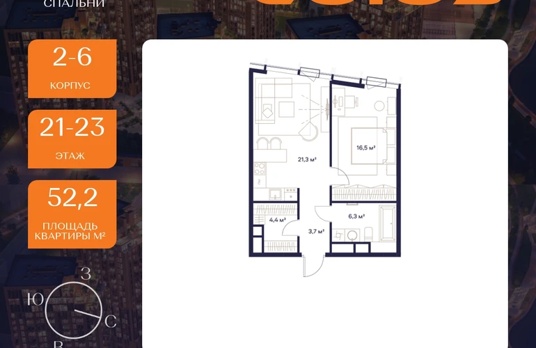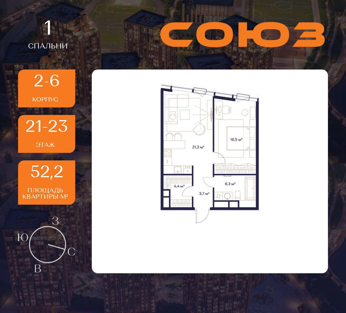Продаётся 1-комнатная квартира площадью 51.3 м² на 21 этаже в Жилом Комплексе «Союз».