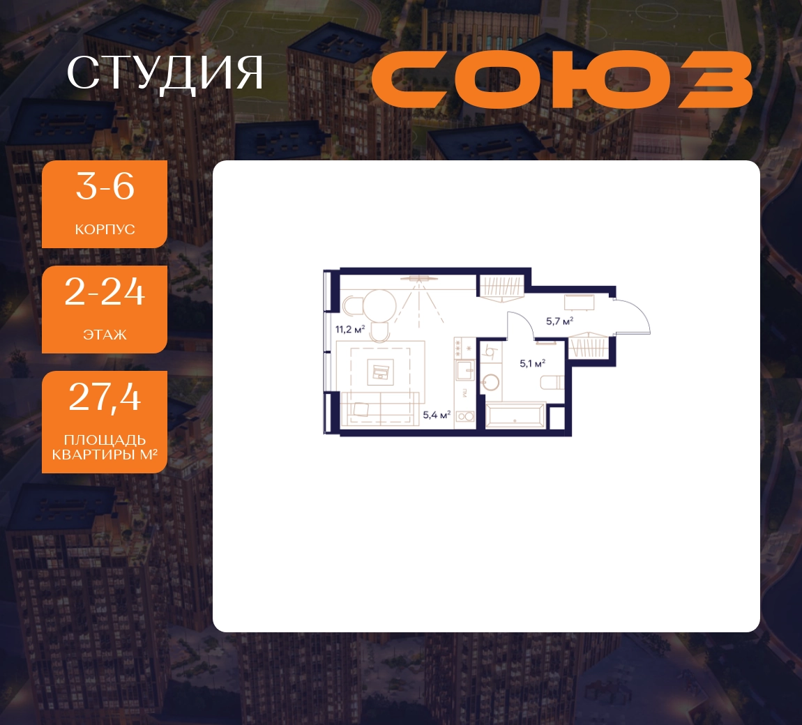Рассрочка 0%Продаётся квартира-студия площадью 27.4 м² на 2 этаже в Жилом Комплексе «Союз».