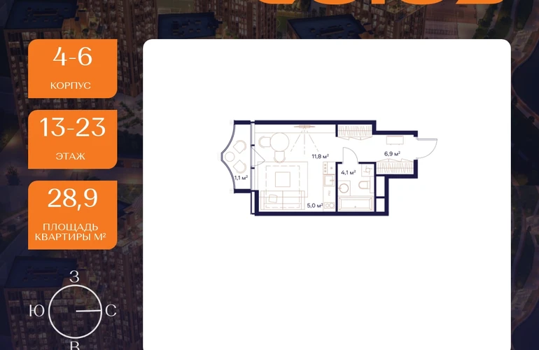 Рассрочка 0%Продаётся квартира-студия площадью 28.9 м² на 13 этаже в Жилом Комплексе «Союз».