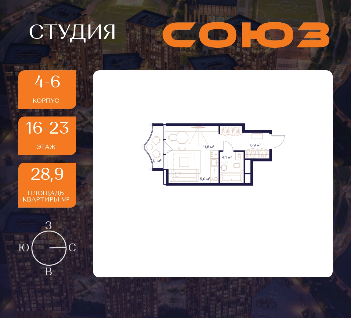 Рассрочка 0%Продаётся квартира-студия площадью 28.9 м² на 16 этаже в Жилом Комплексе «Союз».