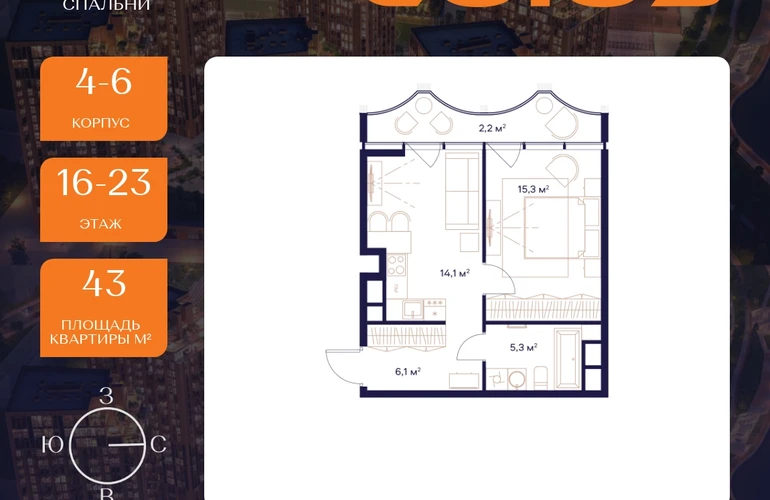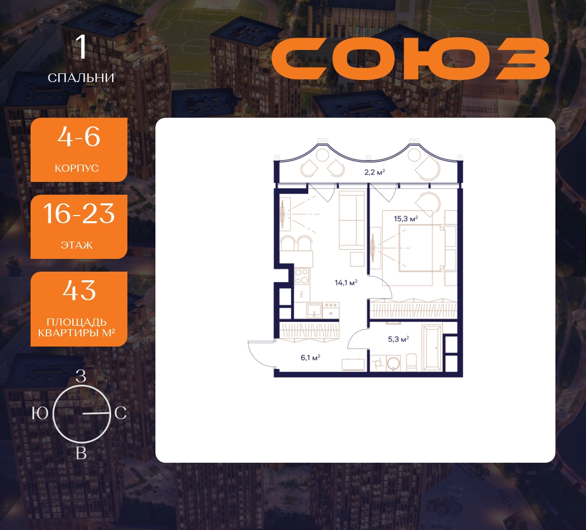 Рассрочка 0%Продаётся 1-комнатная квартира площадью 43 м² на 16 этаже в Жилом Комплексе «Союз».