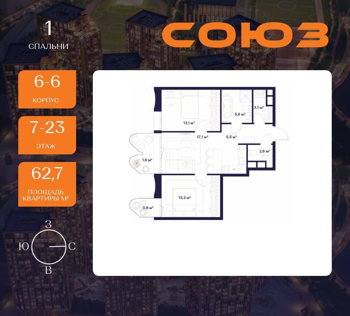 Рассрочка 0%Продаётся 2-комнатная квартира площадью 62.7 м² на 7 этаже в Жилом Комплексе «Союз».