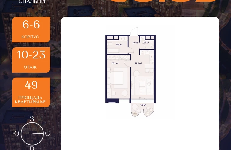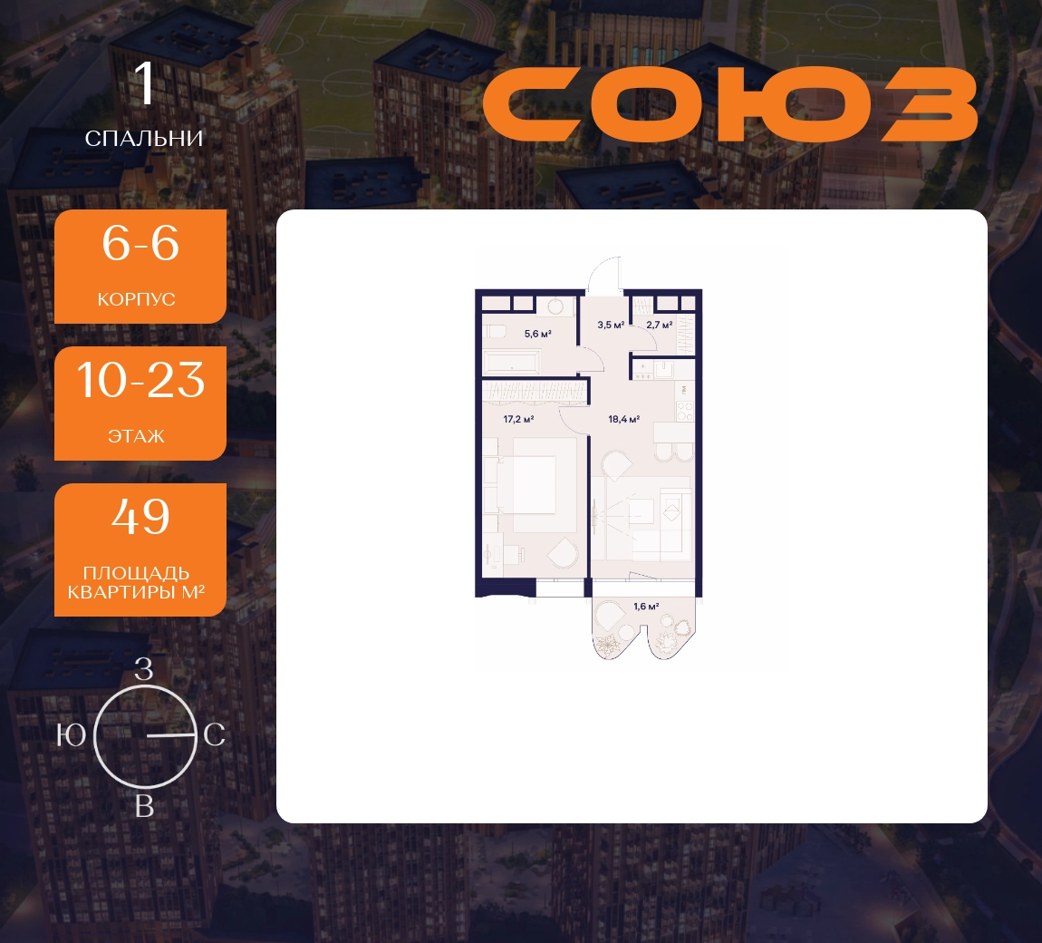 Рассрочка 0%Продаётся 1-комнатная квартира площадью 49 м² на 10 этаже в Жилом Комплексе «Союз».